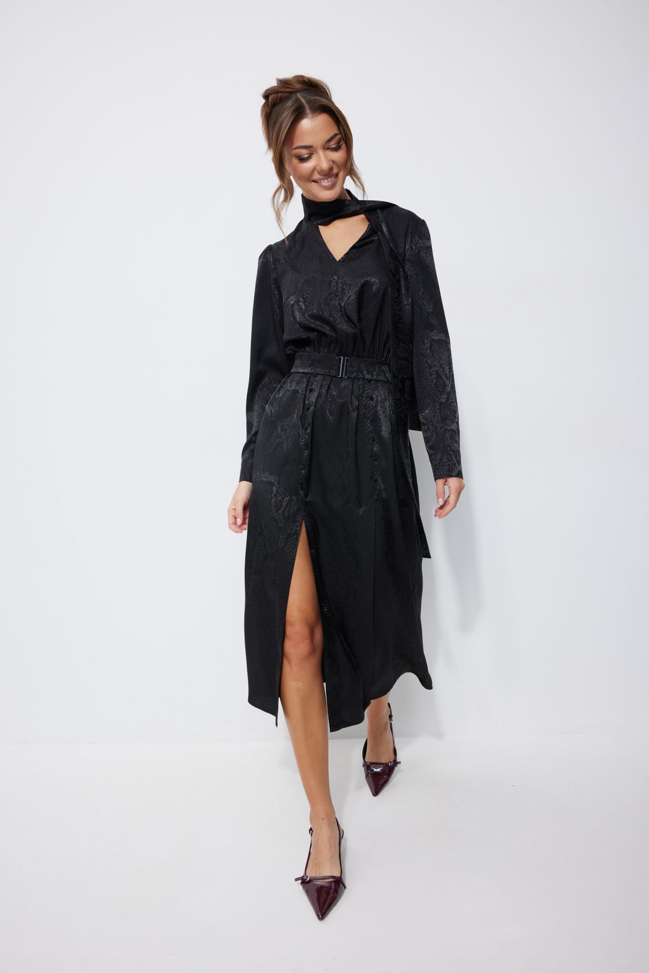 Нарядное платье из жаккардового атласа с анималистичным дизайном. Платье свободного кроя. Отрезное по талии, с резинкой. Рукав длинный, с манжетой с застежкой на петлю с пуговицей. Платье с мягким воротником-стойкой, переходящим в бант-завязки по переду. По переду V-образный вырез по горловине. По переднему полотнищу юбки шлицы в рельефах, рельефы от талии до шлиц декорированы пуговицами. Платье дополняется съемным поясом из основной ткани, с пряжкой. В среднюю часть пояса вставлена резинка. Обращаем Ваше внимание, что фурнитура может незначительно отличаться от фото.