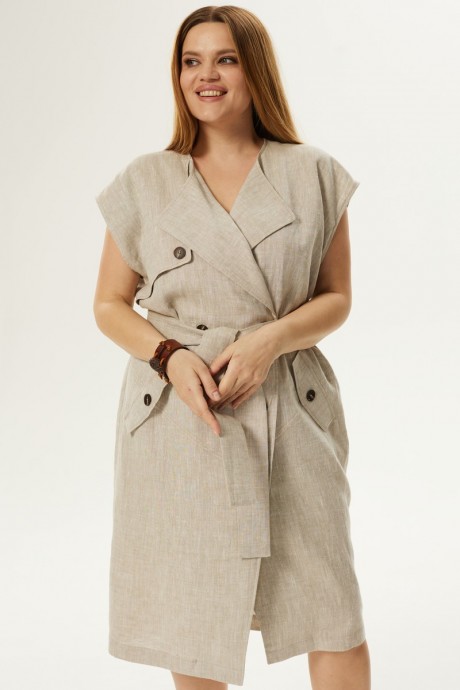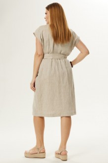 Льняное платье длины миди свободного силуэта. Застежка двубортная на петли и пуговицы. Платье с лацканами, рукав короткий спущенный. На полочке расположен декоративный клапан, зафиксированный пуговицей. Спинка со средним швом.