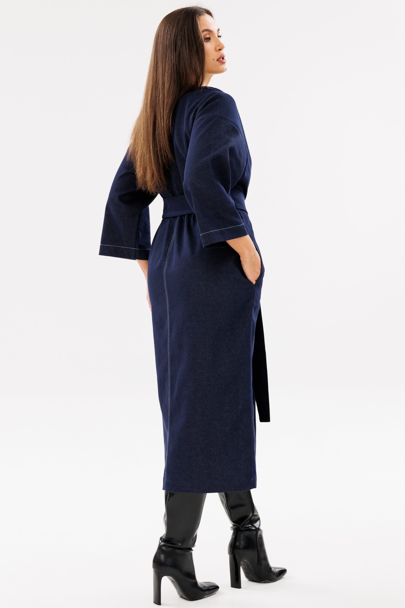 Горловина V-образной формы, обработана обтачкой. Перед со средним цвом, заканчивающимся разрезом. Спинка со средним швом. Рукав одношовный втачной, длиной 3/4. Линия плеча спущена. Швы платья фрагментарно отстрочены декоративной нитью контрастного цвета.