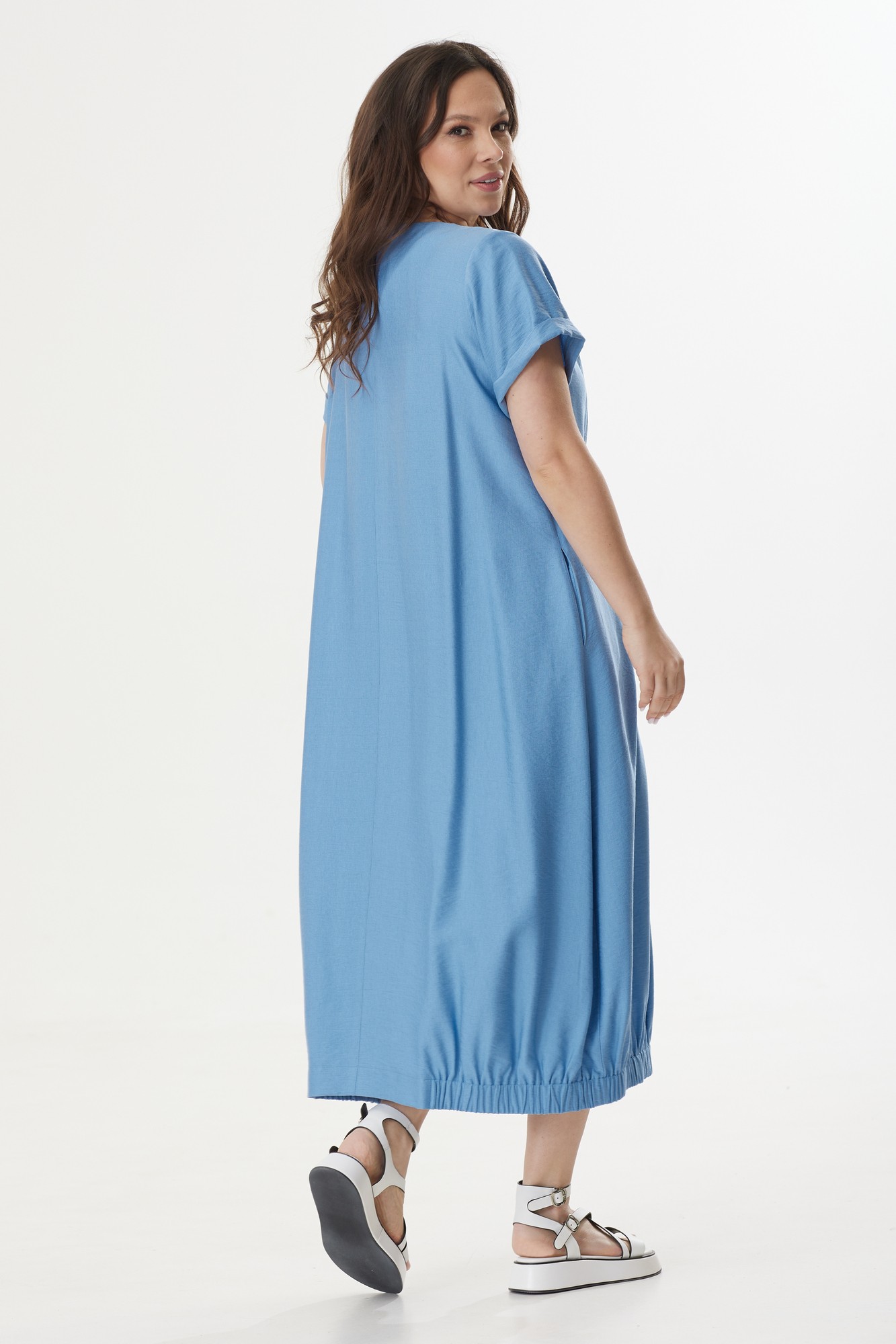 Стильное летнее платье свободного силуэта с коротким втачным рукавом. Оригинальная обработка горловины придает платью неповторимый шарм. По низу платье дополнено сборкой на эластичную тесьму, что придает легкий объем. По спинке застежка на пришивную пуговицу. В боковых швах расположены удобные карманы.