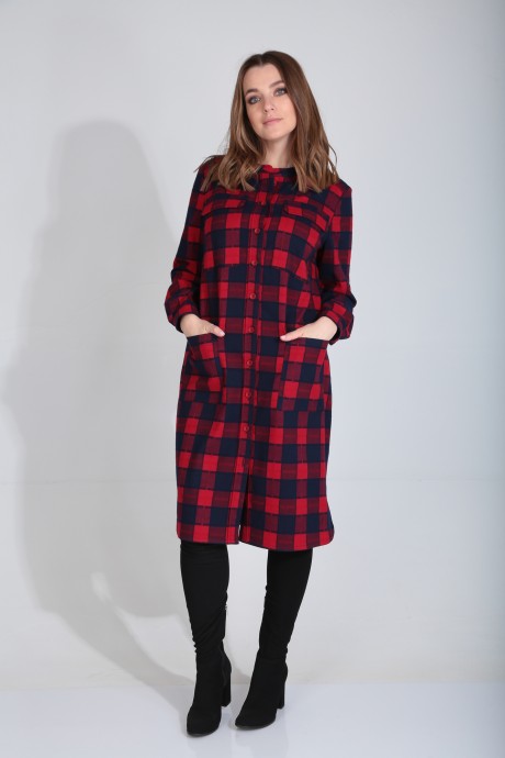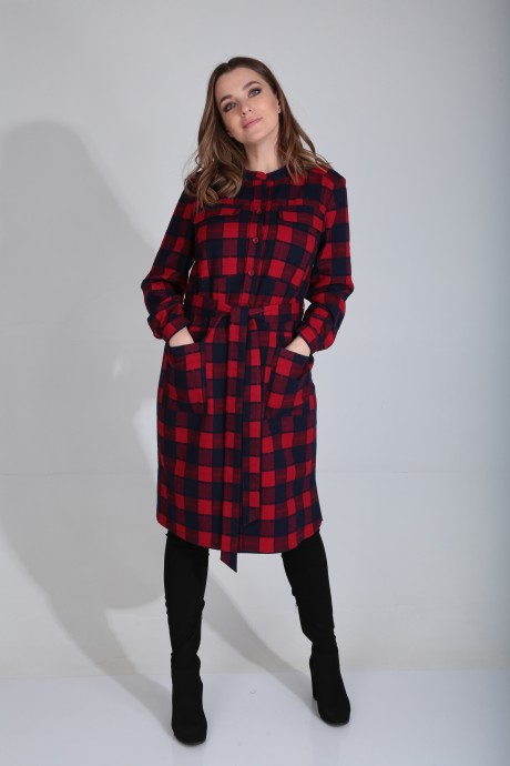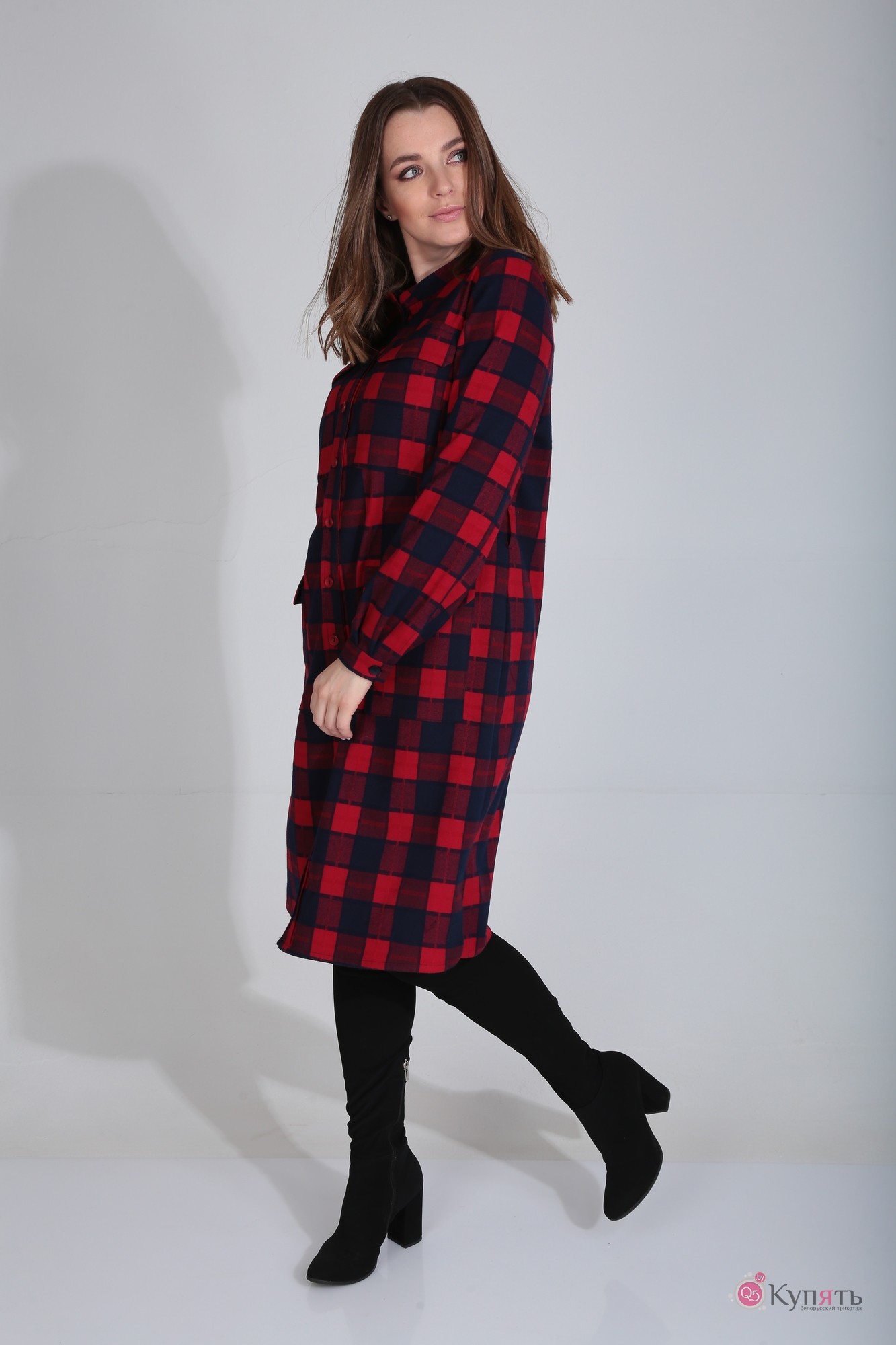 Платье - прямое по переду с планкой на петли и пуговицы. Перед с нагрудными выточками и накладными карманами с клапанами. Низ по боковым швам закруглен. Рукав длинный с манжетой. Горловина обработана стойкой. Пояс съёмный из основной ткани. Рукав двухшовный.