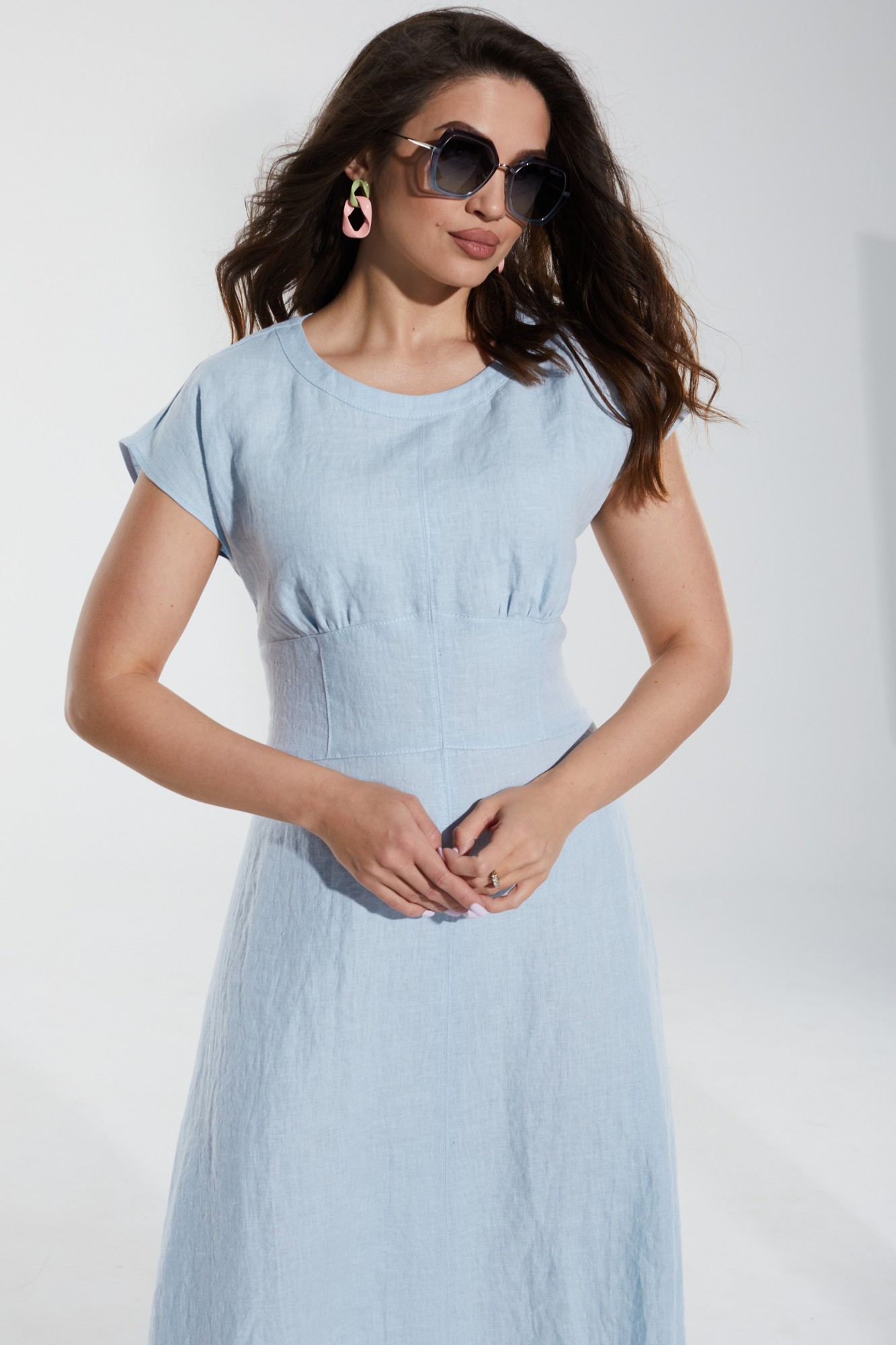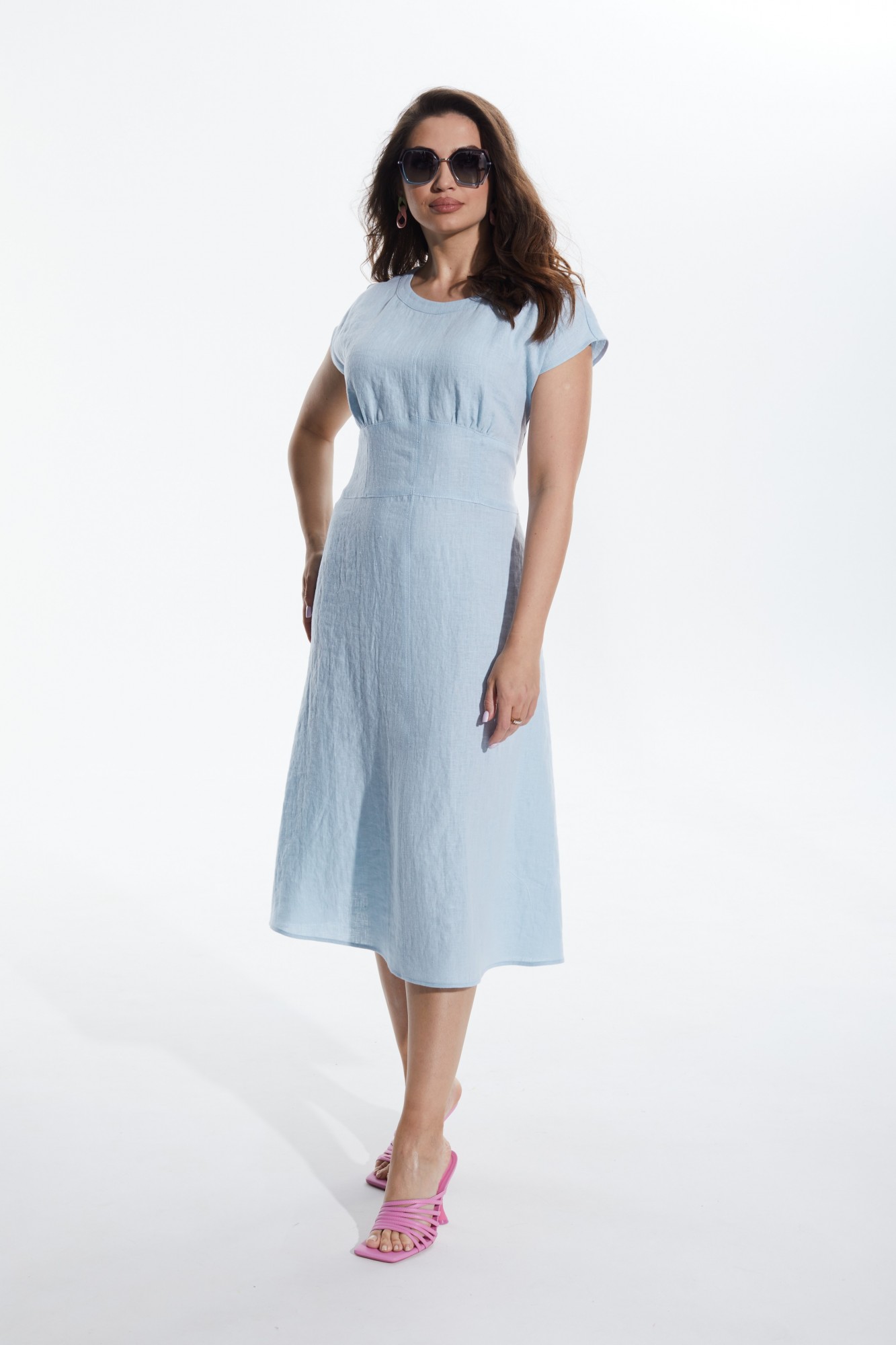 Платье женское полуприлегающего силуэта с расклешением книзу. Перед со средним швом, расстроченный с двух сторон отделочной строчкой, и горизонтальной вставкой в области талии, имитирующей корсетный пояс с рельефами, отстроченными отделочными строчками. Спинка с четырьмя талиевыми вытачками и средним швом, вверху которого выполнена потайная молния до талии. Горловина углублена, округлой формы, на планке. Платье без рукавов, со спущенной линией плеча.