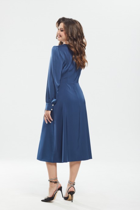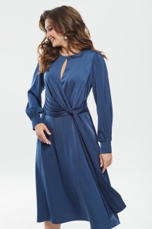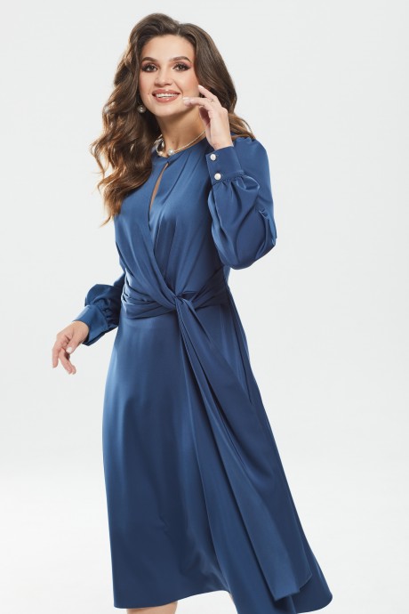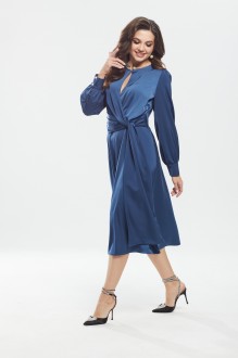 Приталенное платье из текстильной ткани. Отрезное по линии талии с юбкой, расширенной к низу. Спинка со средним швом и застежкой молнией. Перед ассиметричная полочка с декоративным вырезом и декоративным элементом в виде пояса. Рукав втачной длинный на манжете.