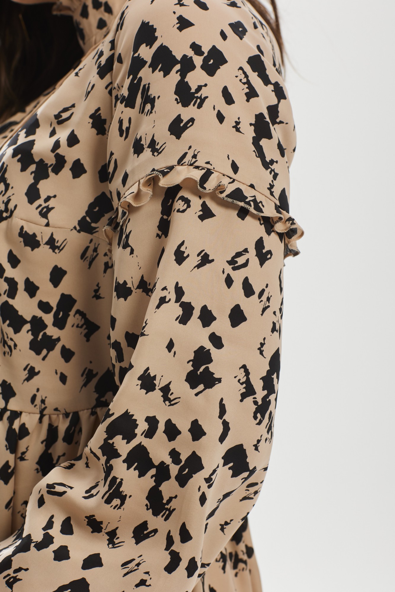 Платье свободного силуэта с двумя воланами по низу. Спинка со средним швом и застежкой-молнией сзади. Воротник стойка с рюшей. Рукава расширенные к низу, собранные на резинку. На рукаве подрез выше локтя со вставленной в шов рюшей. По переду полочки с обеих сторон по 3 защипа. Платье на подкладке.