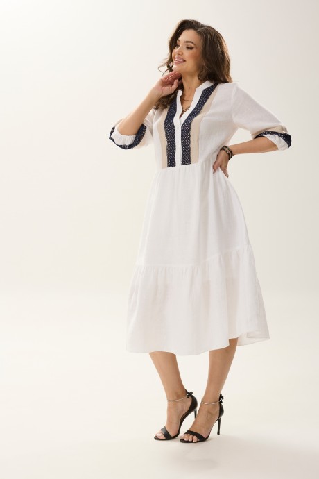 Платье отрезное чуть выше талии. По переду рельефы, отделочная планка, вдоль которой настрочено кружево. Воротник-стойка. Рукав ¾ с отделкой кружевом. По низу рукава резинка. Книзу платье расширено, низ на подкладке.