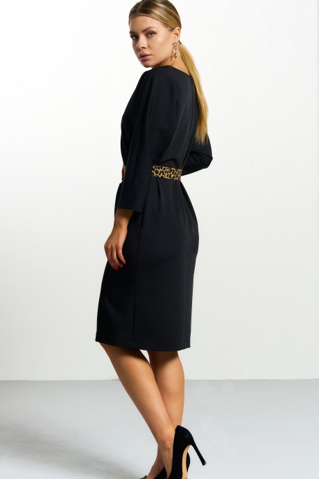 Платье полуприлегающего силуэта с цельнокроеным рукавом. Перед с накладными карманами и разрезом в низу. Спинка на потайную застежку — тесьма «молния». Горловина с разрезом по переду, на обтачке. Пояс съемный на резинке с пряжкой.