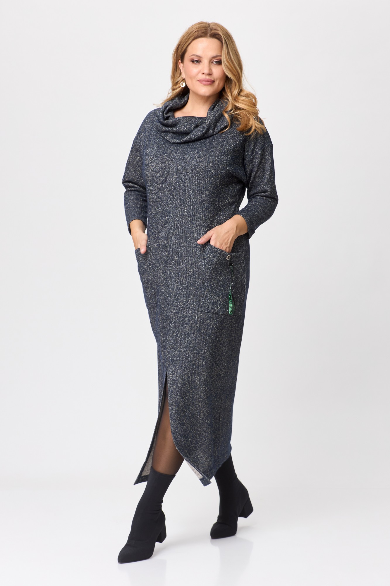 Актуальное удлиненное платье выполнено из хлопкового футера трехнитка с ненавязчивым блеском. Изделие полуприлегающего силуэта хорошо садится по фигуре, скрывая любые недостатки и подчеркивая Ваши достоинства. Центральный шов по переду переходит в разрез до колена, удлиняя силуэт. Рукав приспущенный, длина 7/8. Украшением служат объемный воротник, который прекрасно прячется под верхней одеждой, также имеются накладные карманы, один из которых декорирован тесьмой и блочкой со стразами.