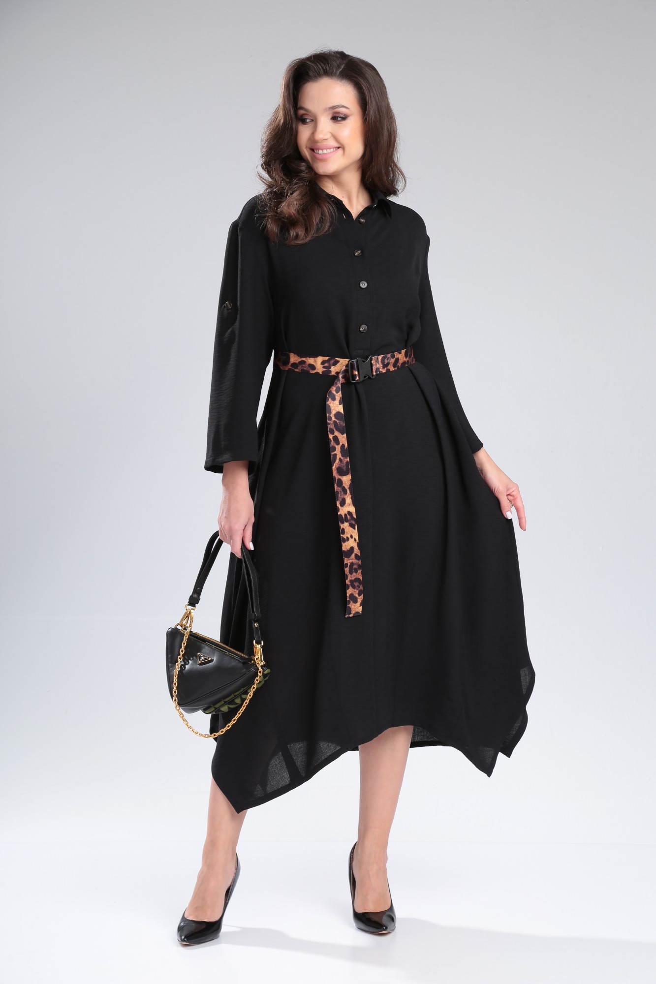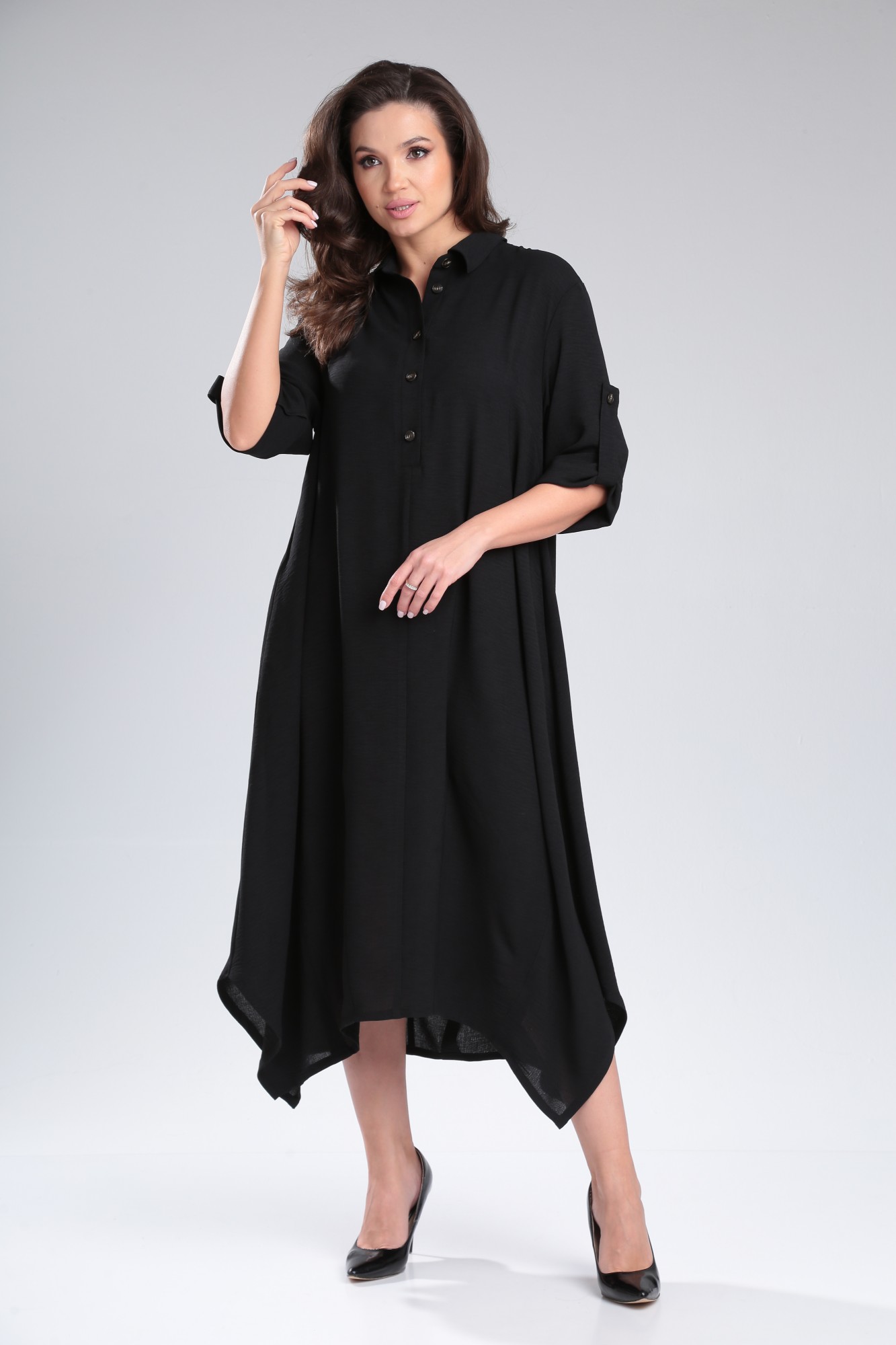 Универсальное платье в стиле «бохо» из плательной ткани. Изделие с рубашечным воротником застежкой на пуговицы, перед с центральным швом и выточками по всему низу, создающими воздушность и объем в нижней части платья. По спинке центральный шов и застроченная встречная складка от горловины, создающая небольшое клешение. Фигурный низ. Плечо спущенное с втачным длинным рукавом, который регулируется с помощью паты и пуговицы. Карманы в боковых швах. Дополнительно платье фиксируется поясом, который идет в комплекте. Изделие может сочетаться как с кедами, лоферами, так и с туфлями и босоножками. Универсальность и практичность платья сделают его любимым в Вашем гардеробе в наступающем сезоне.