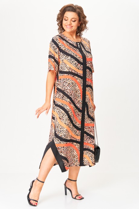 Платье в стиле casual предназначено для повседневной носки, прекрасно сочетается с любой по стилю обувью. Платье выполнено из вискозной ткани, свободного кроя, ниже колена, рукав укорочен. В качестве декора по переду изделия — вставлена планка из контрастной ткани, на планке нанесены небольшие стразы. По бокам изделия — разрезы, которые также обработаны контрастной тканью, в цвет декоративной планки. Также в изделии имеются боковые карманы.