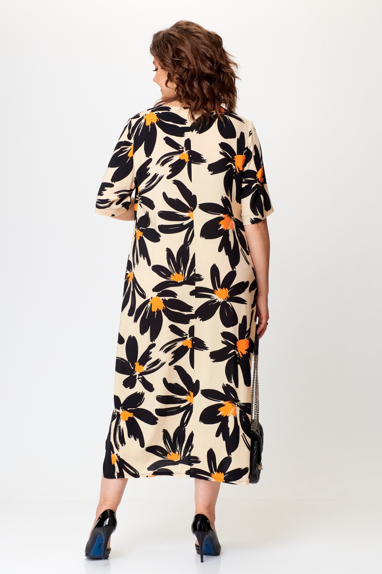 Платье в стиле casual предназначено для повседневной носки, прекрасно сочетается с любой по стилю обувью. Платье выполнено из вискозной ткани, свободного кроя, ниже колена, рукав укорочен. В качестве декора по переду изделия — вставлена планка из контрастной ткани, на планке нанесены небольшие стразы. По бокам изделия — разрезы, которые также обработаны контрастной тканью, в цвет декоративной планки. Также в изделии имеются боковые карманы.