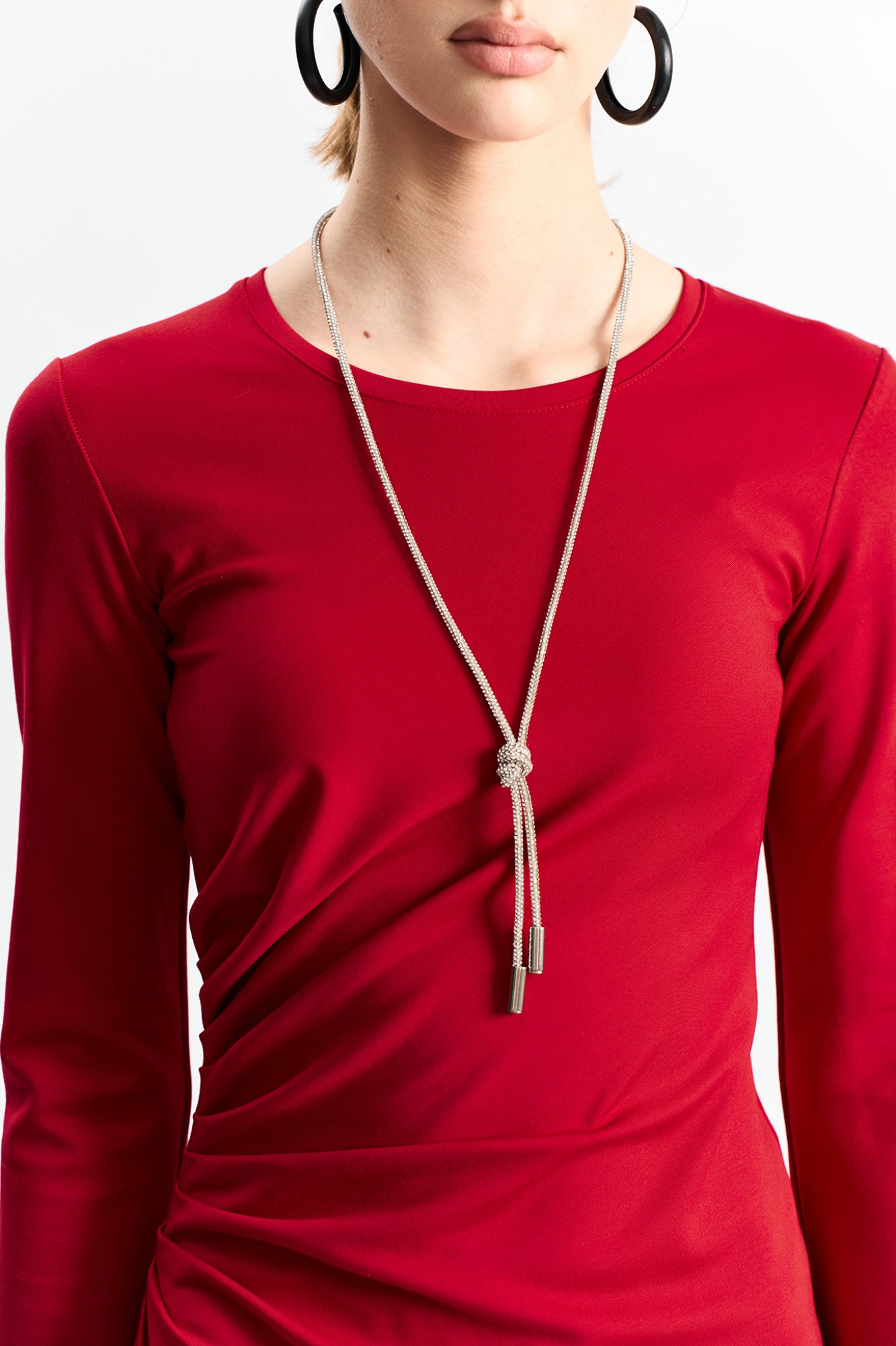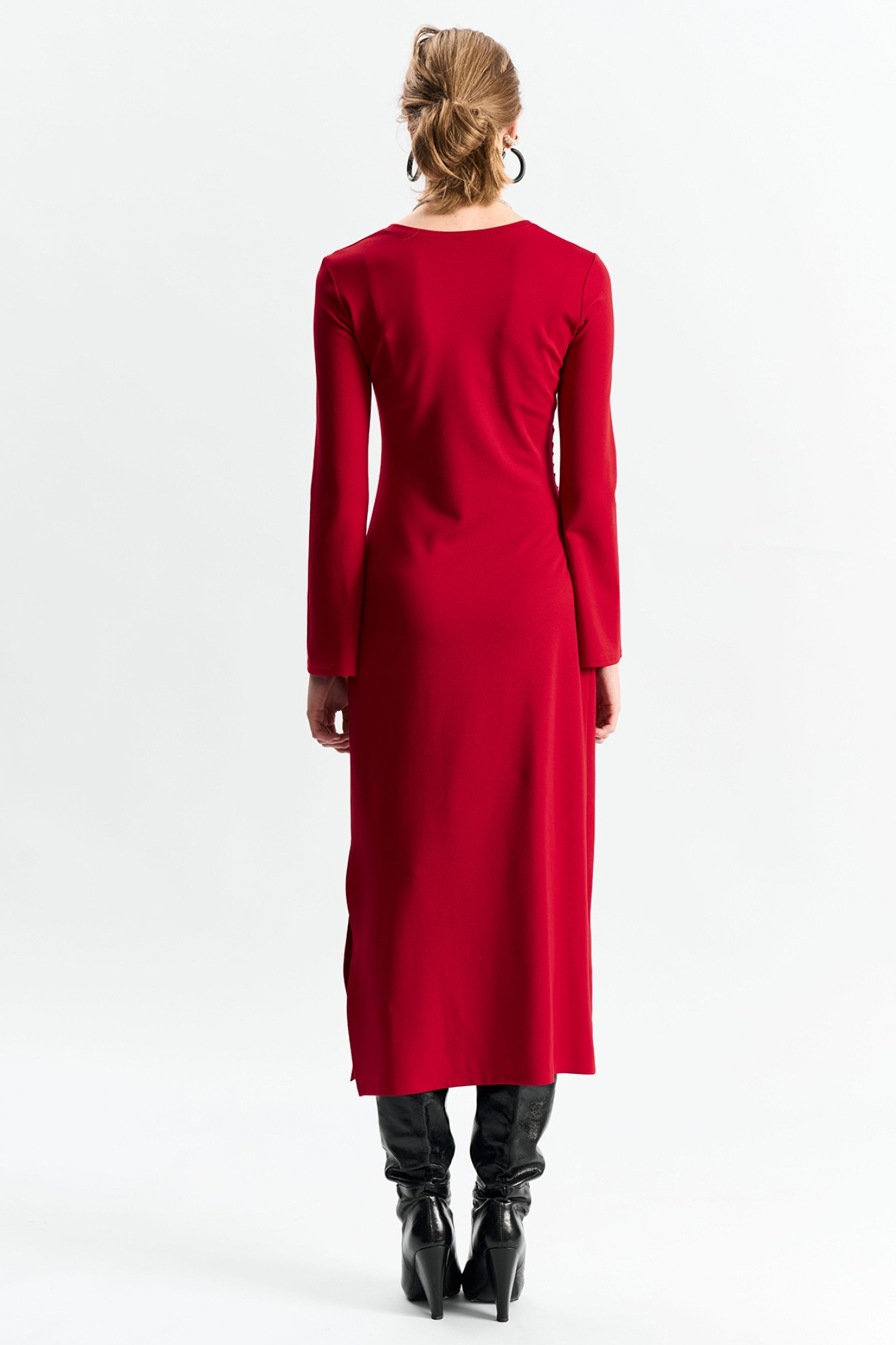 Платье из эластичного материала, прилегающего по талии силуэта, со сборкой в области талии. Юбка А-образного силуэта. Рукав расширяется книзу. Платье без застежки.
