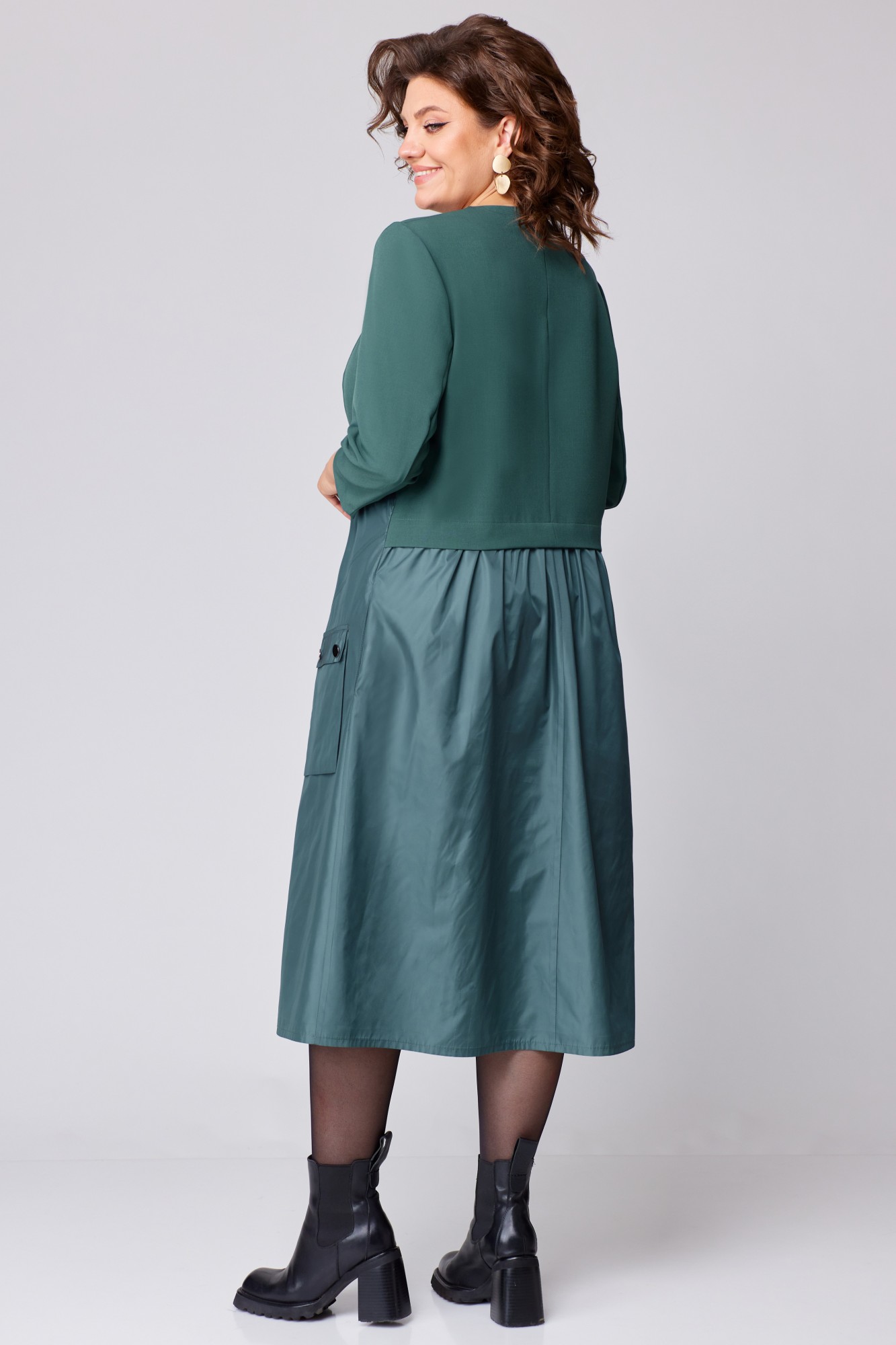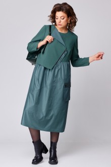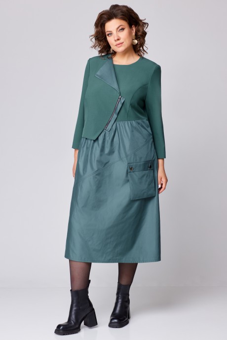 Платье женское А- силуэта. Рукав втачной, двухшовный. По переду отлетная деталь имитирующая «косуху», с декоративной, не функциональной застежкой – молнией. Горловина округлой формы, воротник апаш из отделочной ткани. По линии талии подрез. Нижняя часть платья со сборкой, на подкладке. Выполнена из отделочной ткани с от строчными швами, накладным карманом с клапаном на две петли и пуговицы. Карман функциональный. Спинка со средним швом, отрезная по линии талии, со сборкой из отделочной ткани. В верхней части спинки потайная молния.
