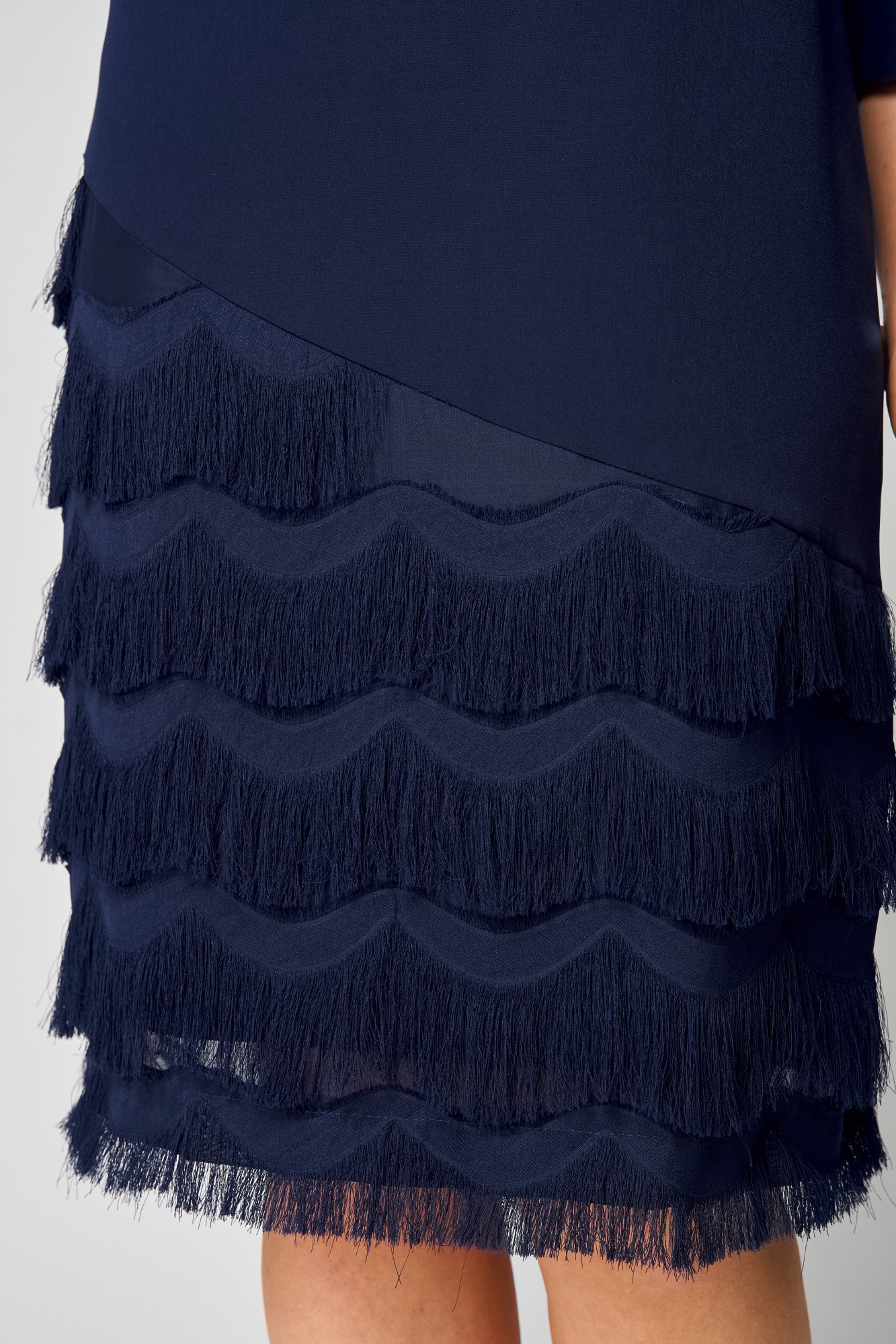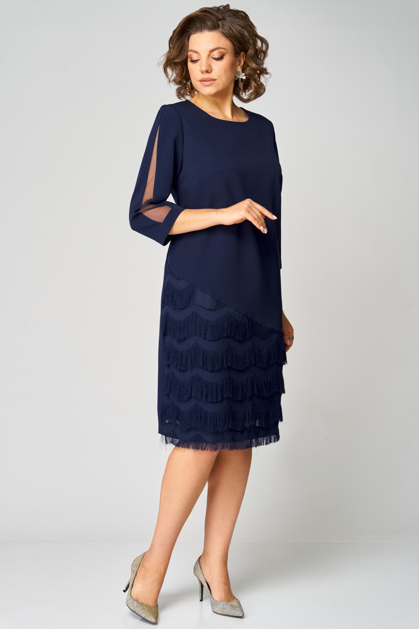 Платье полуприлегающего силуэта. Округлый вырез горловины, обработан обтачкой. Перед с нагрудными вытачками и подрезом из бахромы по диагонали. Трикотажная подкладка идет от подреза только по переду. Рукав втачной, по центру рукава вставка из сетки. Спинка со средним швом и разрезом по низу, застежка на потайную тесьму-молнию.
