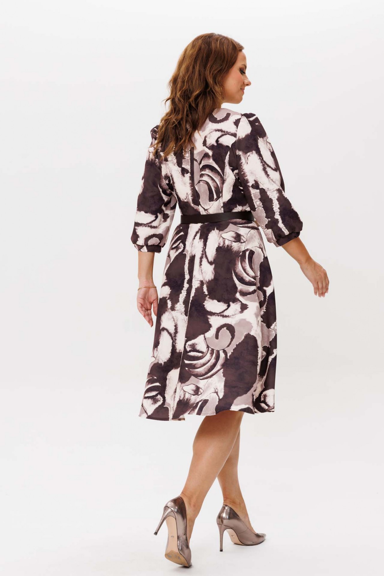 Платье женское полуприлегающего силуэта отрезное по линии талии. Лиф переда с нагрудными и талевыми вытачками. Горловина V-образная. По среднему шву спинки сверху застёжка потайная молния. Юбка расклешённая. Рукава одно шовные втачные, по низу рукава манжета, по окату в области плеча небольшая сборка. Изделие дополняет ремень. Платье без подкладки.
