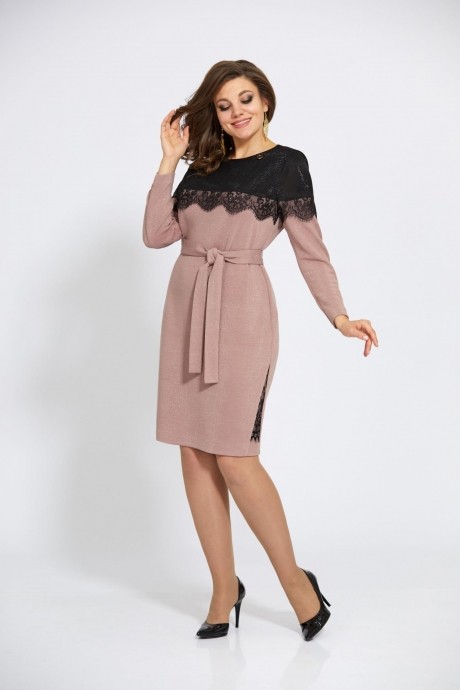 Платье женское полуприлегающего силуэта комбинированное из разных по цвету и фактуре тканей. По переду и спинке кокетки из контрастной ткани. Спинка с центральным швом и застёжкой потайная тесьма молния. Горловина круглая. Рукава одно шовные втачные с локтевой вытачкой, верх рукавов из контрастной ткани. Украшает платье кружево. Дополнением служит пояс.