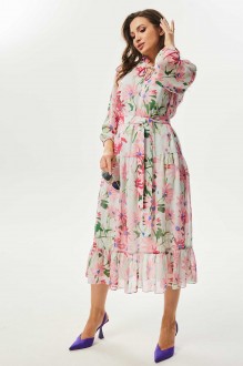 Платье женское в длине миди, отрезное по линии бедра. Вырез неглубокий V-образный на завязках, воротник - втачная двойная рюша. Рукав на тонкой резинке, удобно регулируемый по длине. В комплекте пояс. Платье на телесной трикотажной подкладке, за счет чего не просвечивает, но выглядит легко и воздушно.