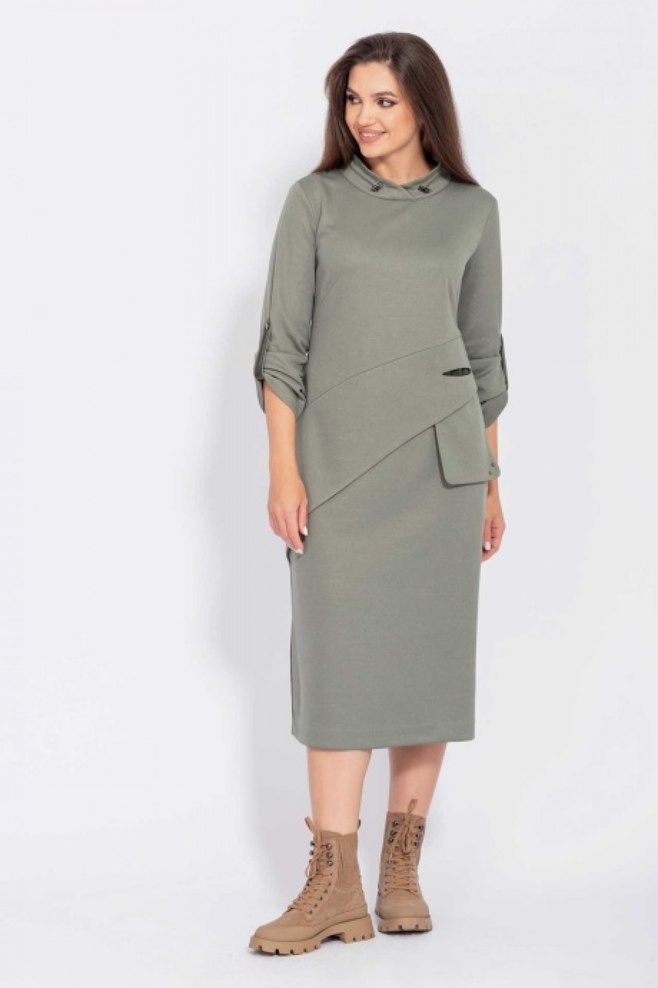Платье женское полуприлегающего силуэта выполнено из трикотажного полотна. По переду нагрудные вытачки, косой подрез, притачной декоративный элемент с навесным прорезным карманом. Спинка с талевыми вытачками и центральным швом. Воротник стойка. Рукава одношовные втачные. Платье без подкладки.