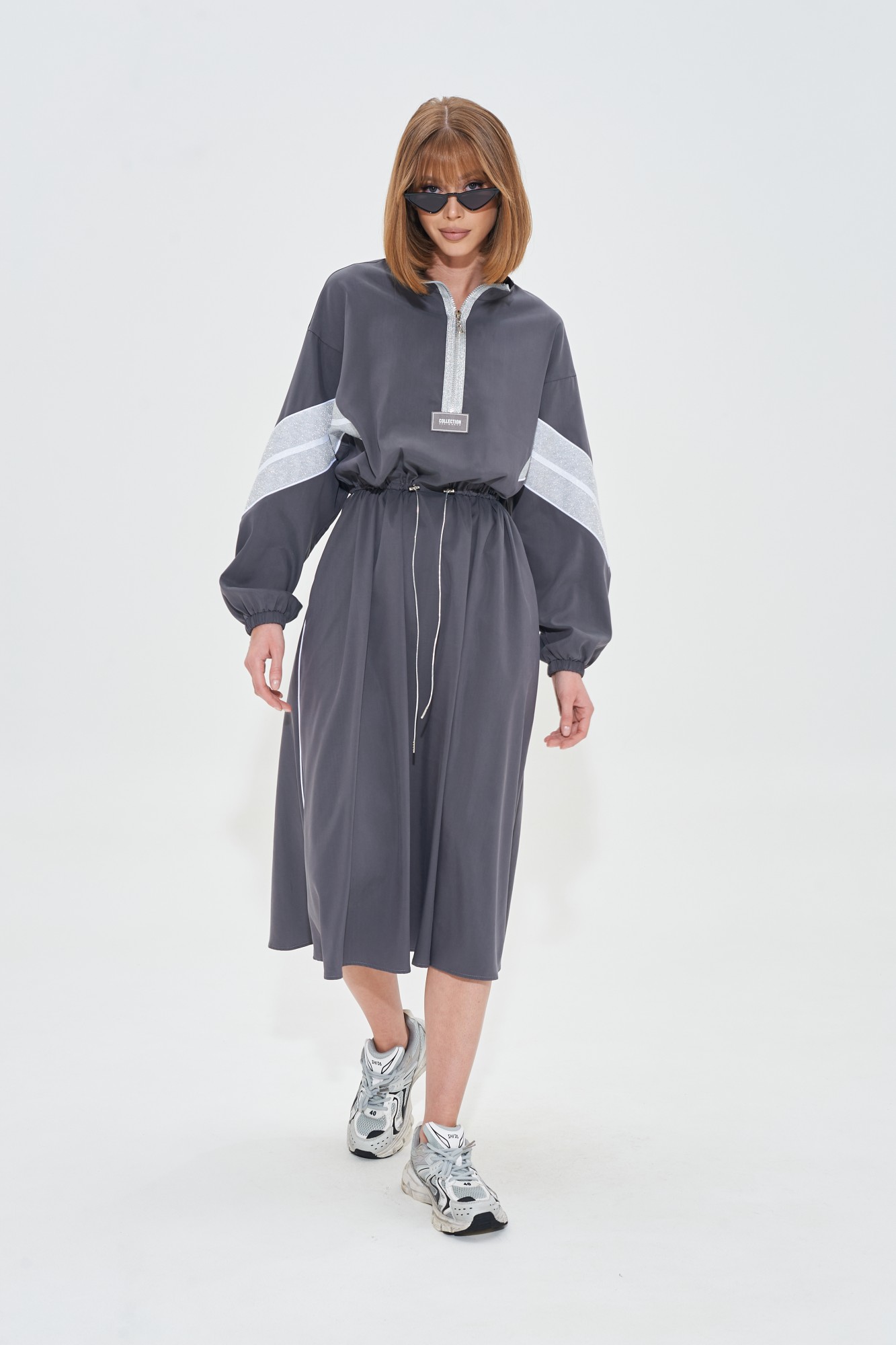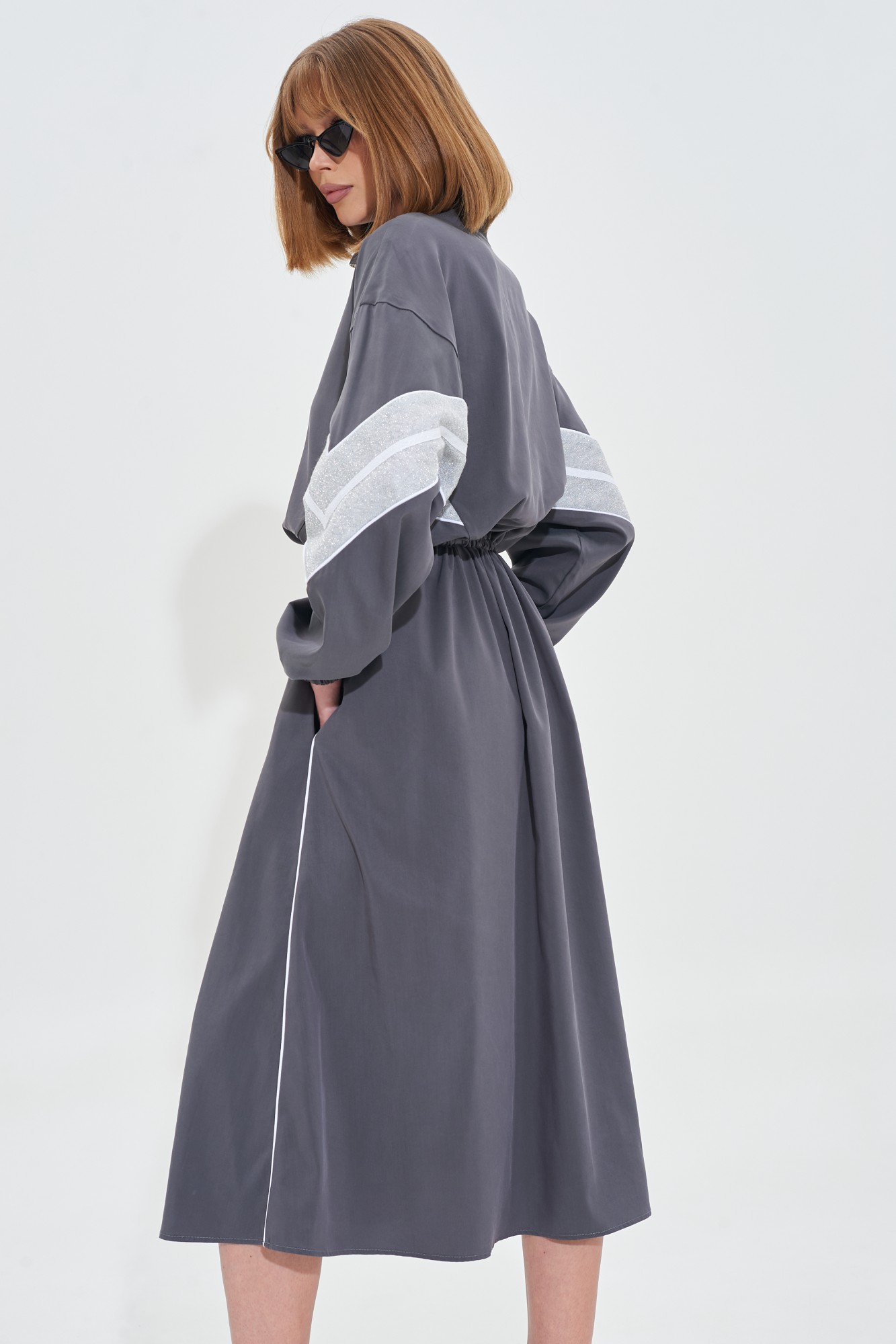 Платье свободного силуэта с кулисой по талии. Молния по переду. Рукава широкие с вставками из ткани компаньона - хлопкового трикотажного полотна с добавлением мягкой люрексной нити . На вставке тесьма с люрексной нитью и кант в швах. В боковых швах карманы.