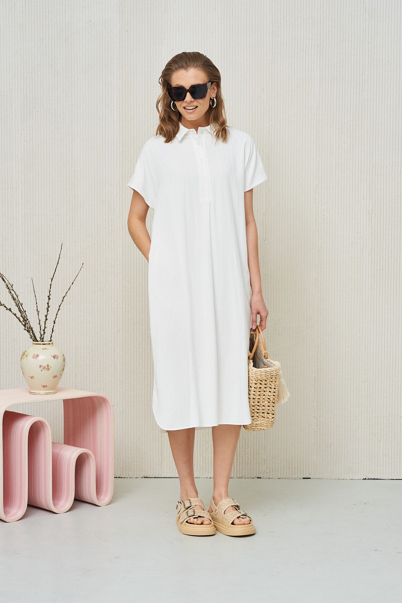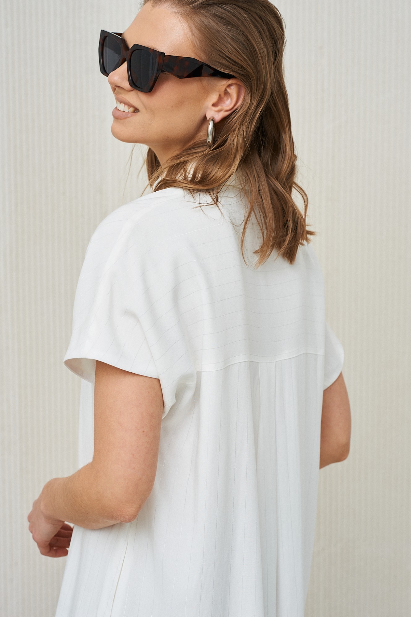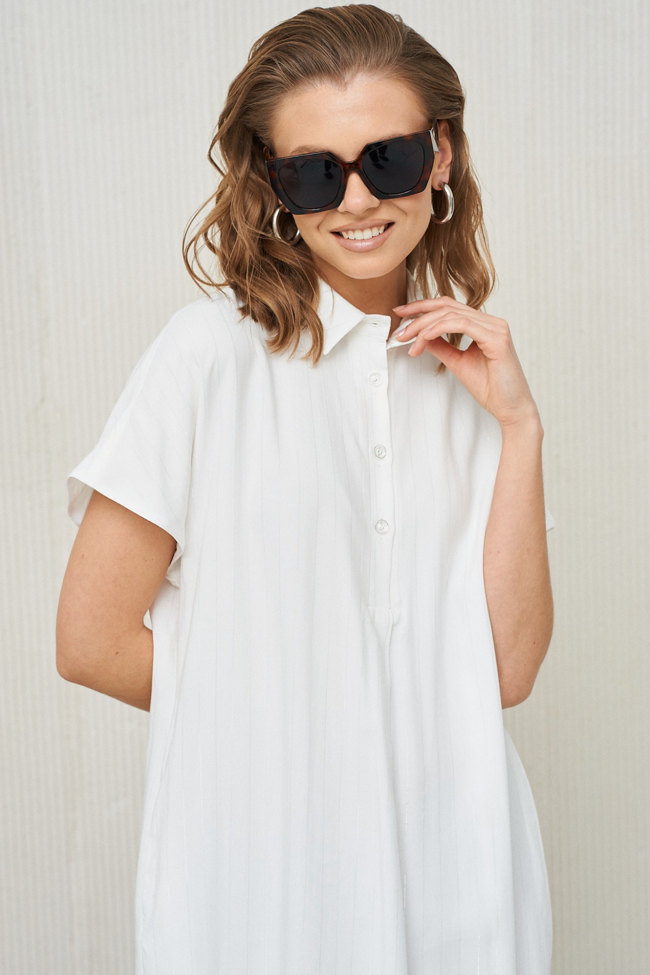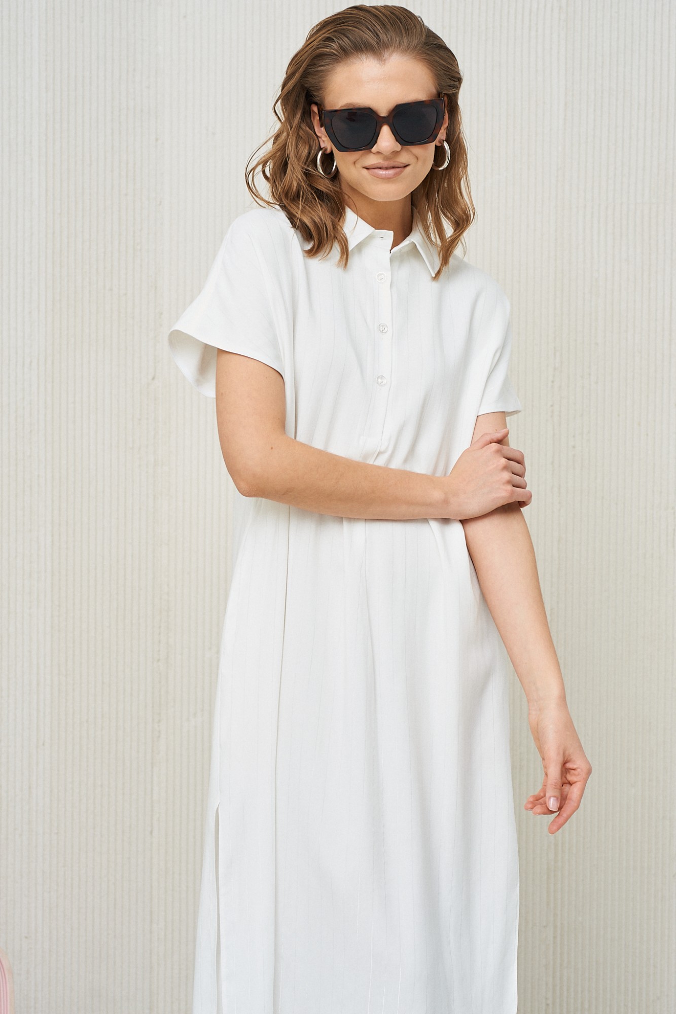 Платье свободного силуэта из приятной вискозной ткани в мелкую серебристую полоску.