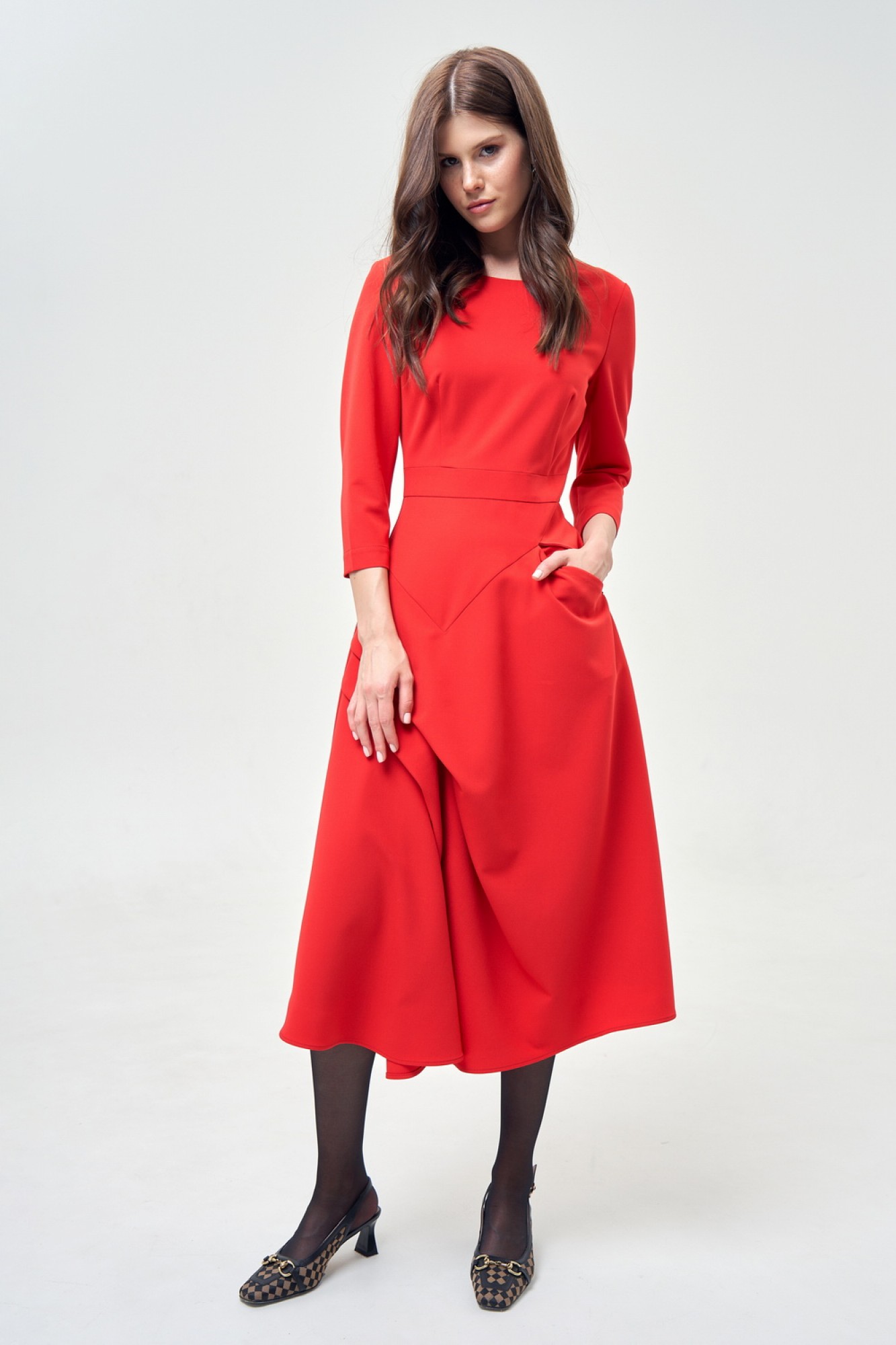 Платье миди приталенного силуэта на подкладке из костюмно-плательной ткани. По талии отрезное с имитацией притачного пояса, По лифу спинки и полочки талиевые вытачки. Юбка платья разведена к низу, передняя юбка с подрезом, в котором карман на молнии. Кокеткой и глубокими складками от бокового к центру. Рукав прямой двухшовный, длиной 3/4,горловина круглая на обтачках, сзади по спинке молния.