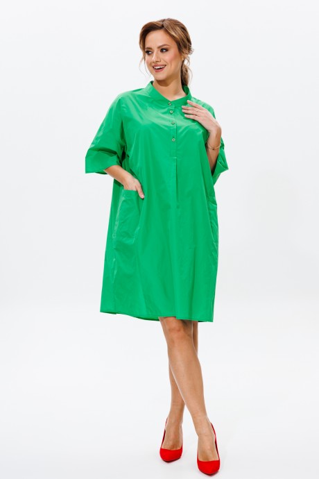 Платье свободного прямого силуэта «оверсайз», выполненное из тафты (не тянется). По переду рельефные швы, накладные карманы. По спинке кокетка и встречная складка для свободы движения. Рукава одношовные. Горловина оформлена воротником-стойкой. Застежка на отрезную планку, на петли-пуговицы.