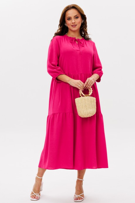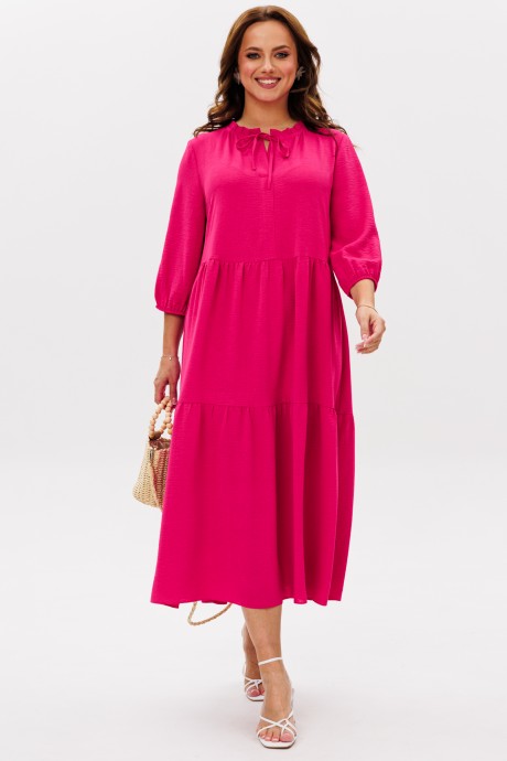 Стильное женское платье свободного силуэта, выполнено из плательной ткани (чуть тянется). Платье отрезное чуть выше линии талии. Верхняя часть переда с V-образным вырезом и цельнокроеными планками. Горловина оформлена рюшей, присборенной резинкой с завязками. По нижней части платья два ряда присборенных воланов. Рукава втачные одношовные, по низу собраны на резинку. Платье без подкладки.