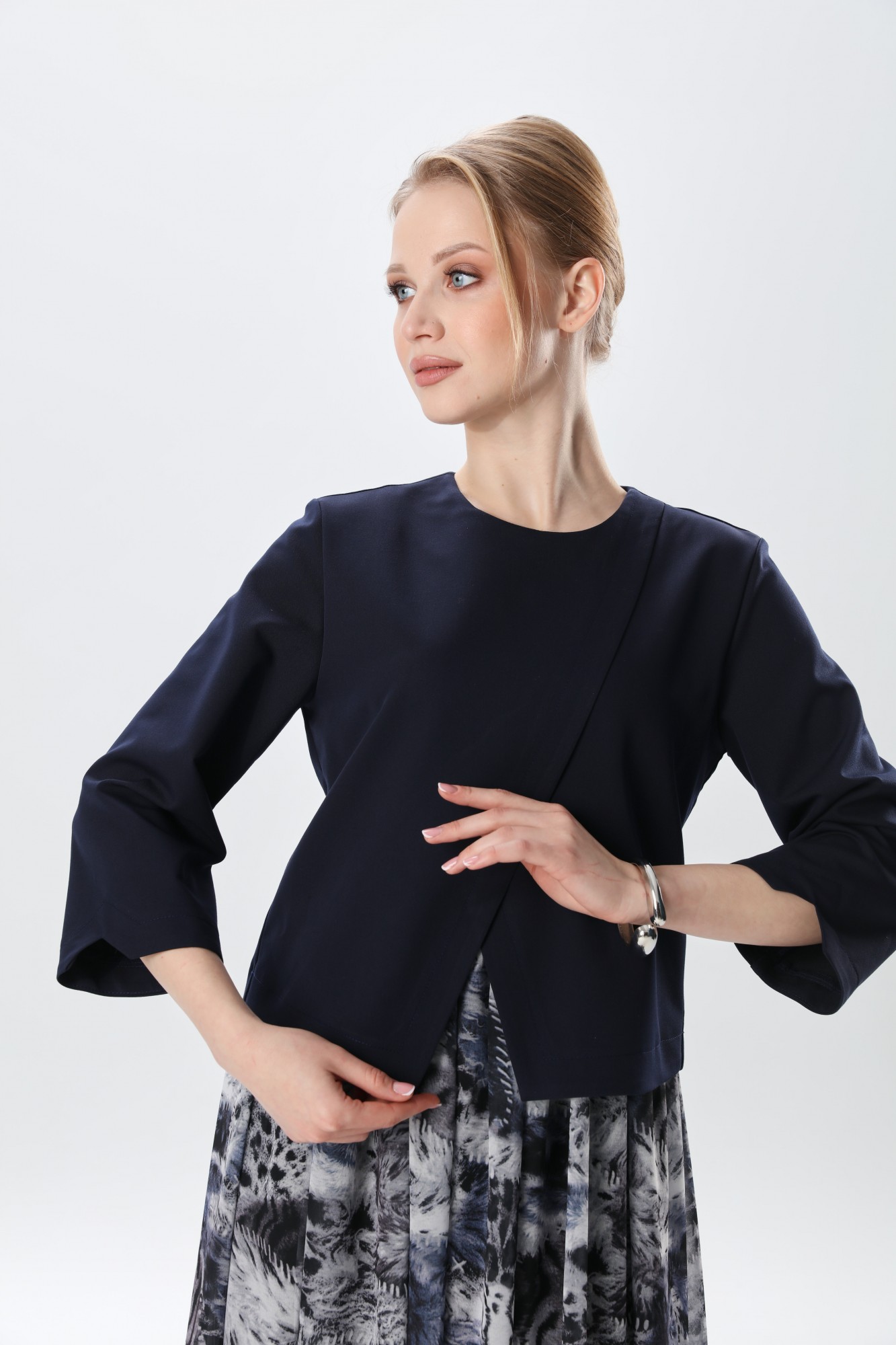 Платье макси комбинированное, двухцветное. Лиф с имитацией застёжки на запах по переду, фигурный по низу, выполнен из костюмной ткани. Вырез горловины полукруглый, по спинке застежка на молнию. Рукава втачные. Юбка на резинке, драпирующаяся, расширенного силуэта из шифона. На подкладке.