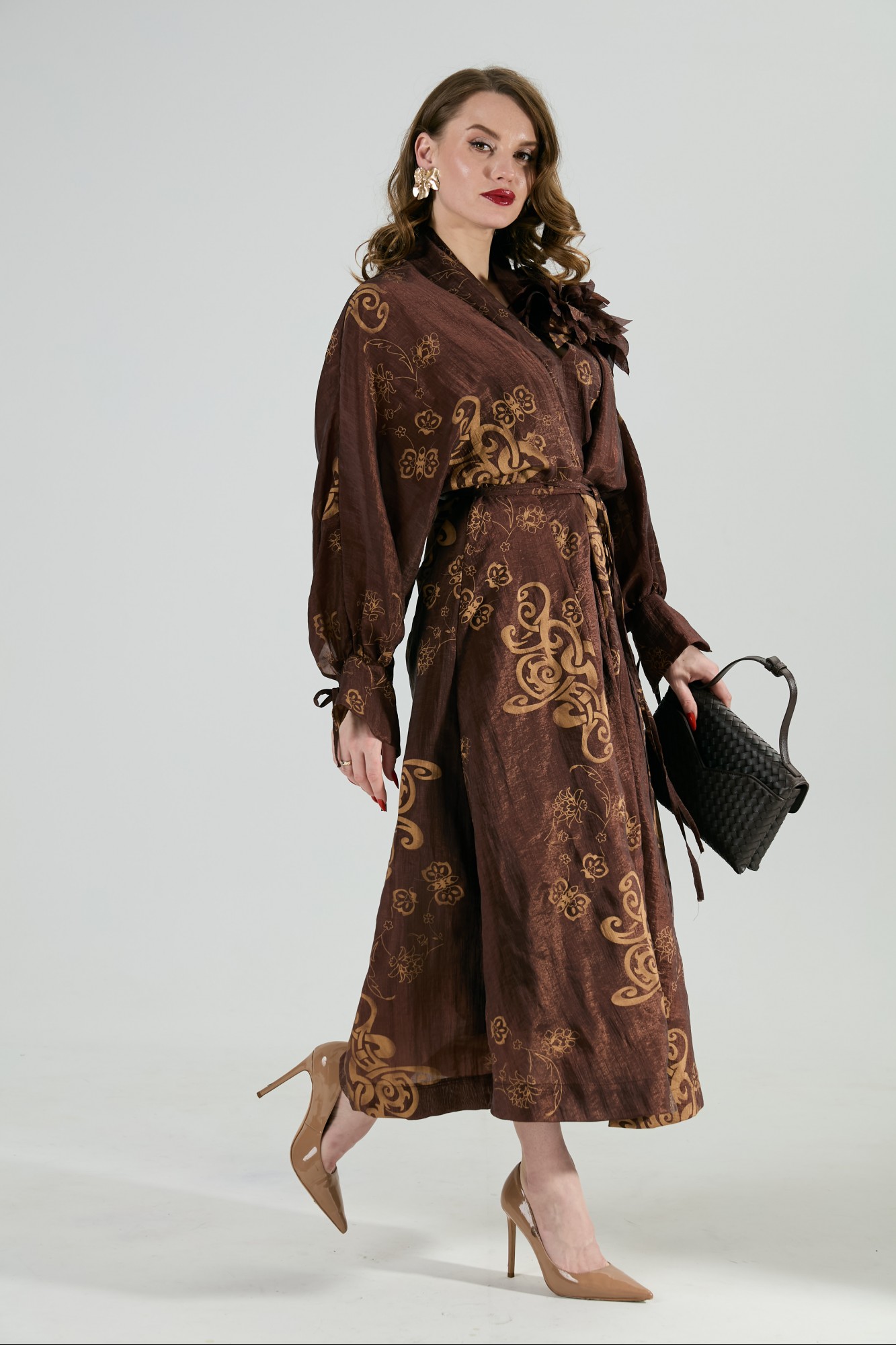 Платье состоит из двух платьев: верхнего и нижнего. Верхнее платье с авторским орнаментом свободного кроя длиной миди с цельнокроеным рукавом и подрезом по линии талии. Перед со средним швом, переходящим в V-образный вырез горловину и разрез от середины бедра. В верхней части переда выполнены рельефные швы до уровня подреза. Объем по линии талии регулируется завязками, закрепленными в рельефных швах переда. Средняя часть переда переходит в стойку. По низу рукавов складки и манжеты с завязками. Низ и разрез обработаны широкой подгибкой с закрытым срезом. Нижнее платье комбинация на регулируемых бретелях. В комплект к изделию идет авторская брошь в виде цветка ручной работы. Лимитированная серия.