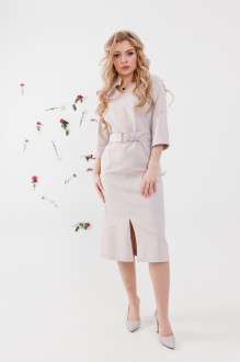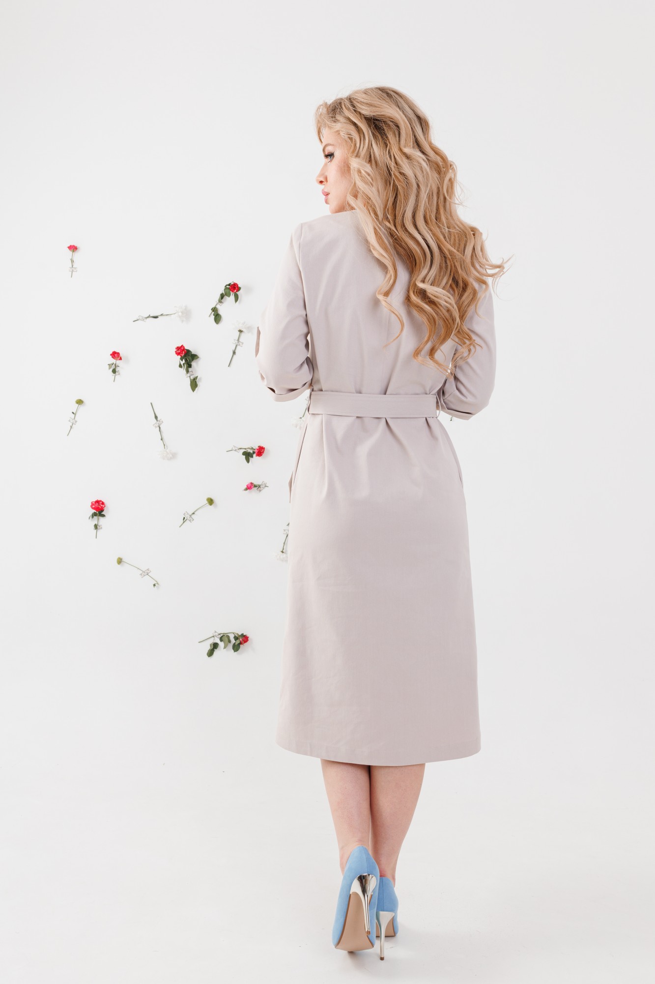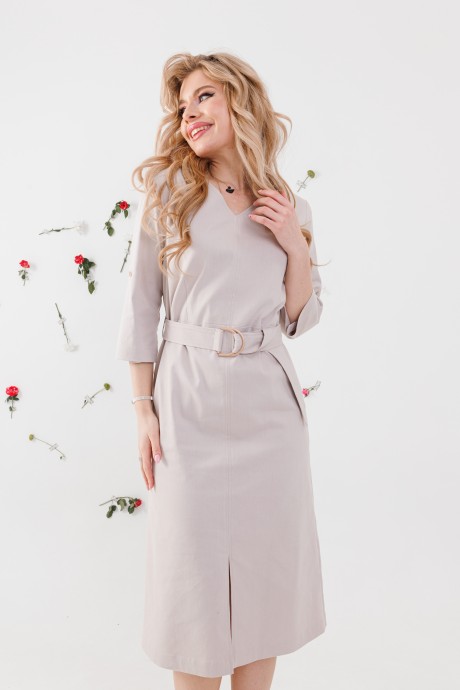 Элегантное платье свободного прямого кроя из облегчённого денима, горловина V-образной формы. Приспущенная линия плеча, рукав три четверти. Разрез по среднему шву. Изделие с карманами. По спинке потайная молния. В комплект входит пояс из основной ткани, декорирован полукольцами.
