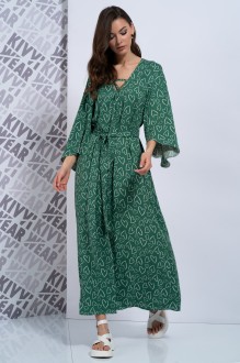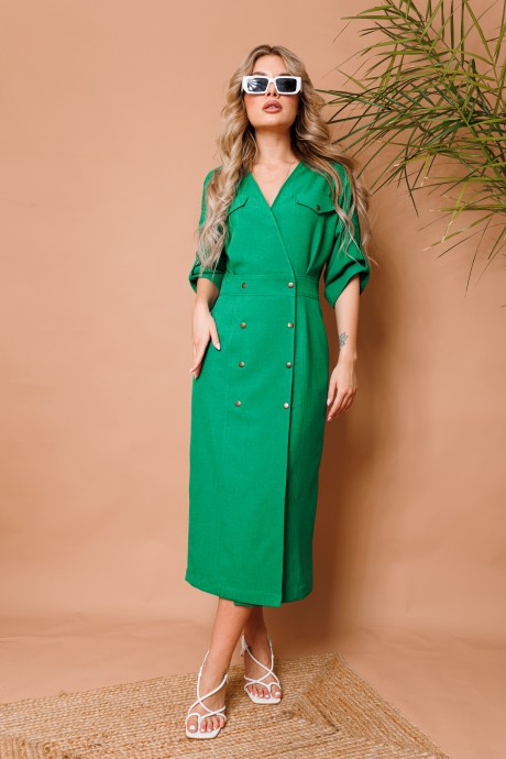 Эффектное двубортное платье длиной миди из облегчённого денима полуприлегающего силуэта. Линия плеча приспущена, рукав втачной три четверти с манжетой и патой. Горловина обработана обтачкой с V-образным вырезом. Линия талии акцентирована притачным поясом. Имеются карманы в боковых швах. Изделие застёгивается на кнопки. Без подкладки.
