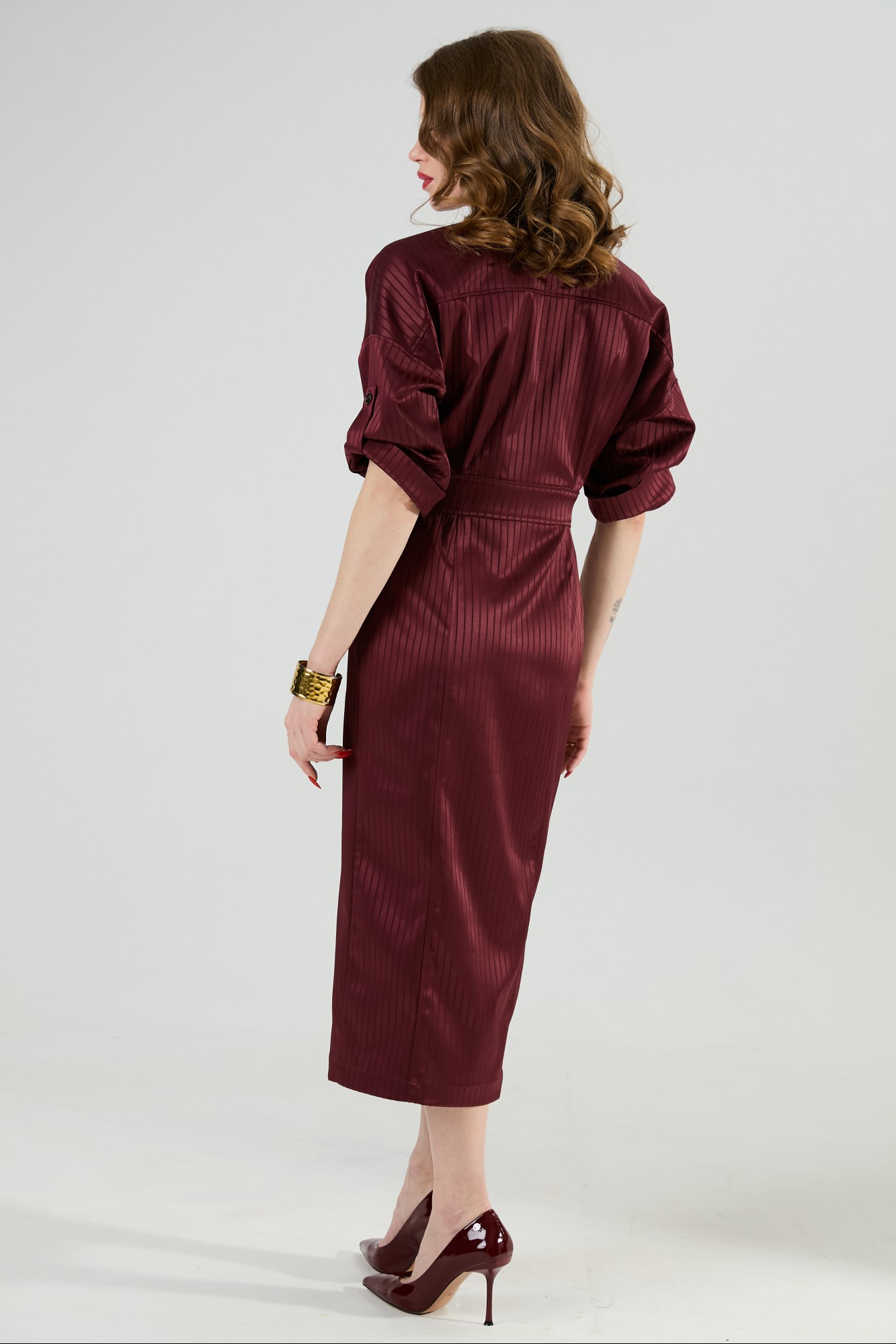 Эффектное двубортное платье длиной миди полуприлегающего силуэта. Линия плеча приспущена, рукав втачной три четверти с манжетой и патой. Горловина обработана обтачкой с V-образным вырезом, декорирована пайетками. Линия талии акцентирована притачным поясом. Имеются карманы в боковых швах. Изделие застёгивается на пуговицы. Без подкладки.