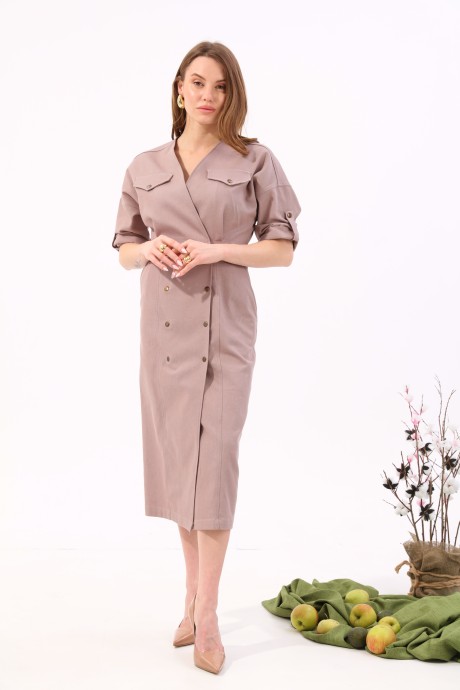 Эффектное двубортное платье длиной миди из денима полуприлегающего силуэта. Линия плеча приспущена, рукав втачной три четверти с манжетой и патой. Горловина обработана обтачкой с V-образным вырезом. Линия талии акцентирована притачным поясом. Имеются карманы в боковых швах. Изделие застёгивается на кнопки. Без подкладки.