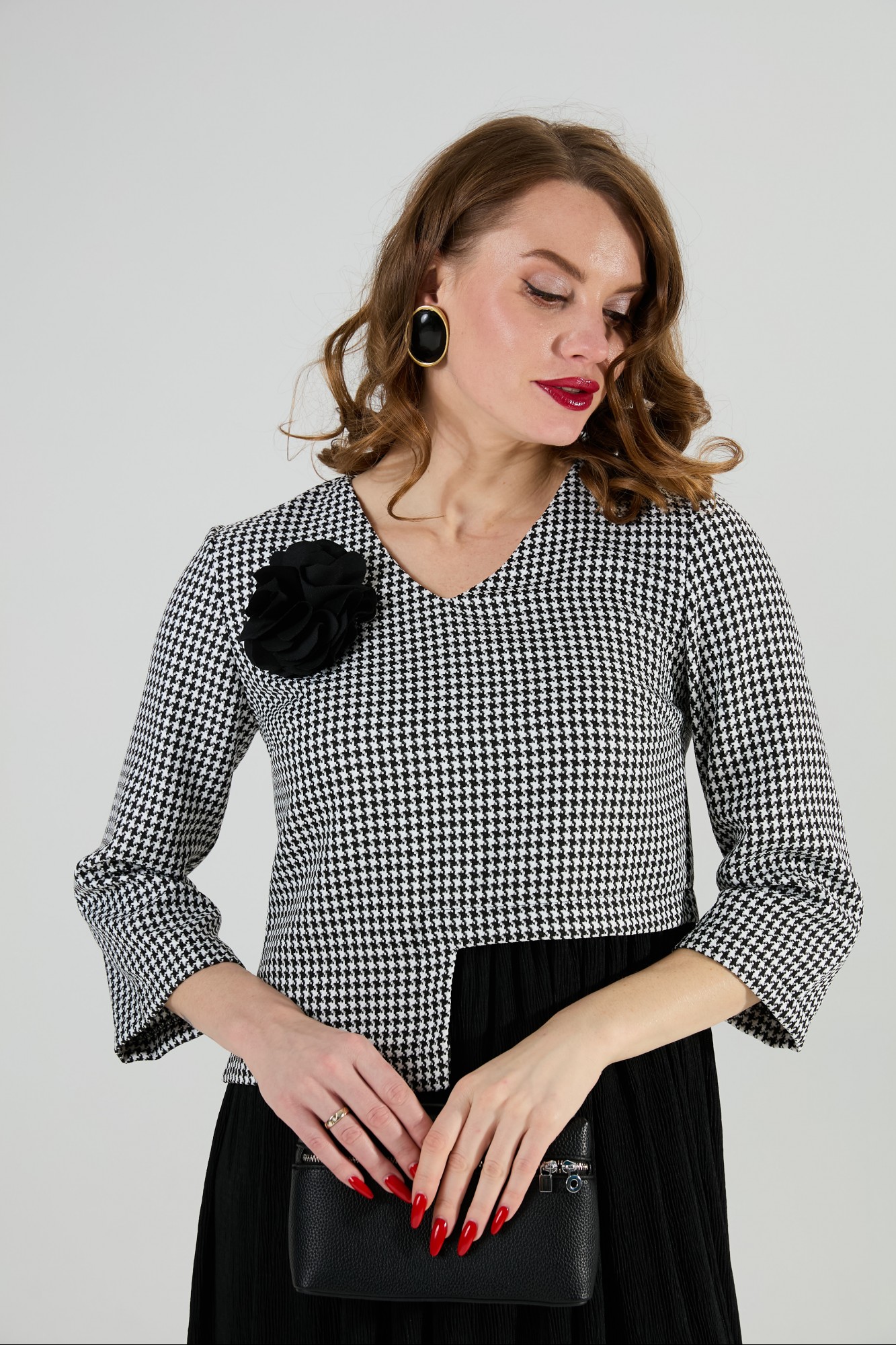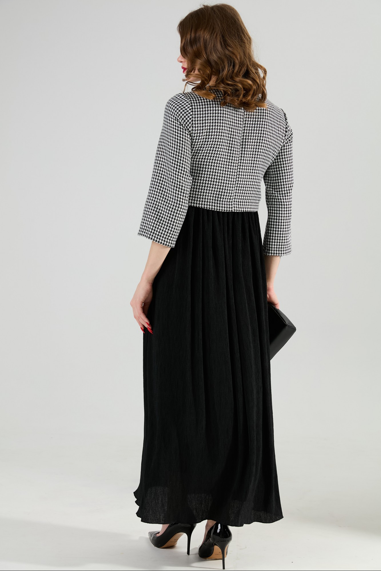 Платье свободного силуэта с фигурным лифом, на молнии по спинке, отрезное по линии талии. Горловина с V-образным вырезом. Рукава втачные три четверти. По переду подрезы по талии. Изделие на подкладке. В комплект к изделию идёт авторская съёмная брошь ручной работы.