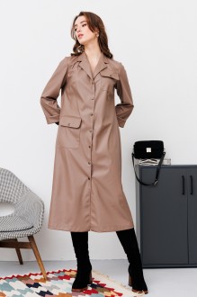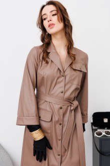 Классическое платье-рубашка из экокожи на хлопковой основе длиной миди с английским воротником и навесным фигурным поясом. На полочке асимметрично расположены накладные карманы с клапанами. По спинке фигурная кокетка. Рукава с цельнокроеными отворотами длиной 7/8. Застежка бортовая на кнопки.