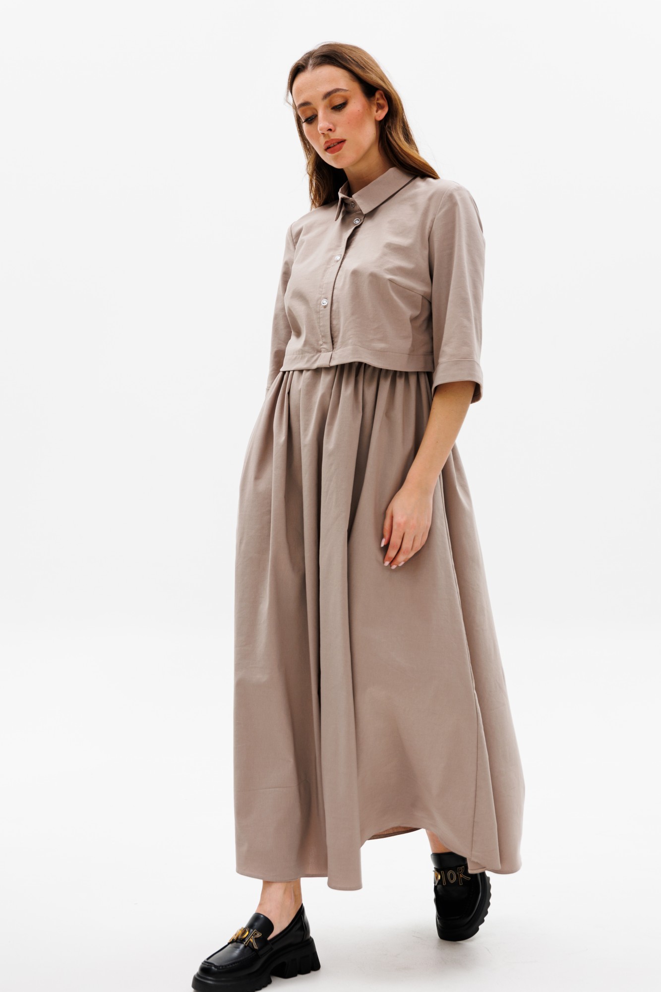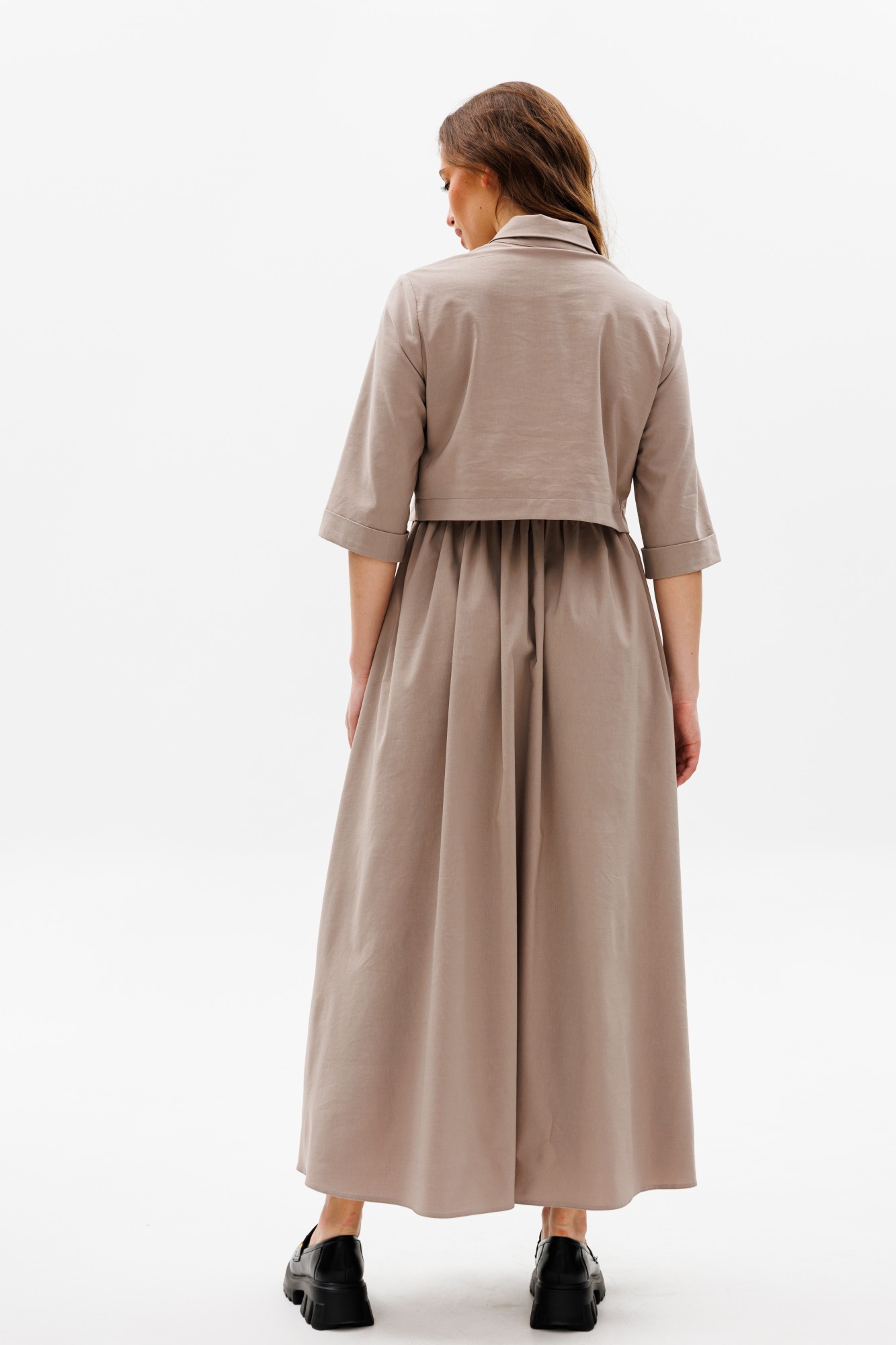 Комфортное платье, состоящее из лифа и юбки, имитирующее костюм-двойку. Лиф прямого кроя с втачным рукавом три четверти. Горловина обработана рубашечным воротником с отрезной стойкой. Застёжка центральная на пуговицы. По талии собрано на резинку. Юбка А-силуэта.