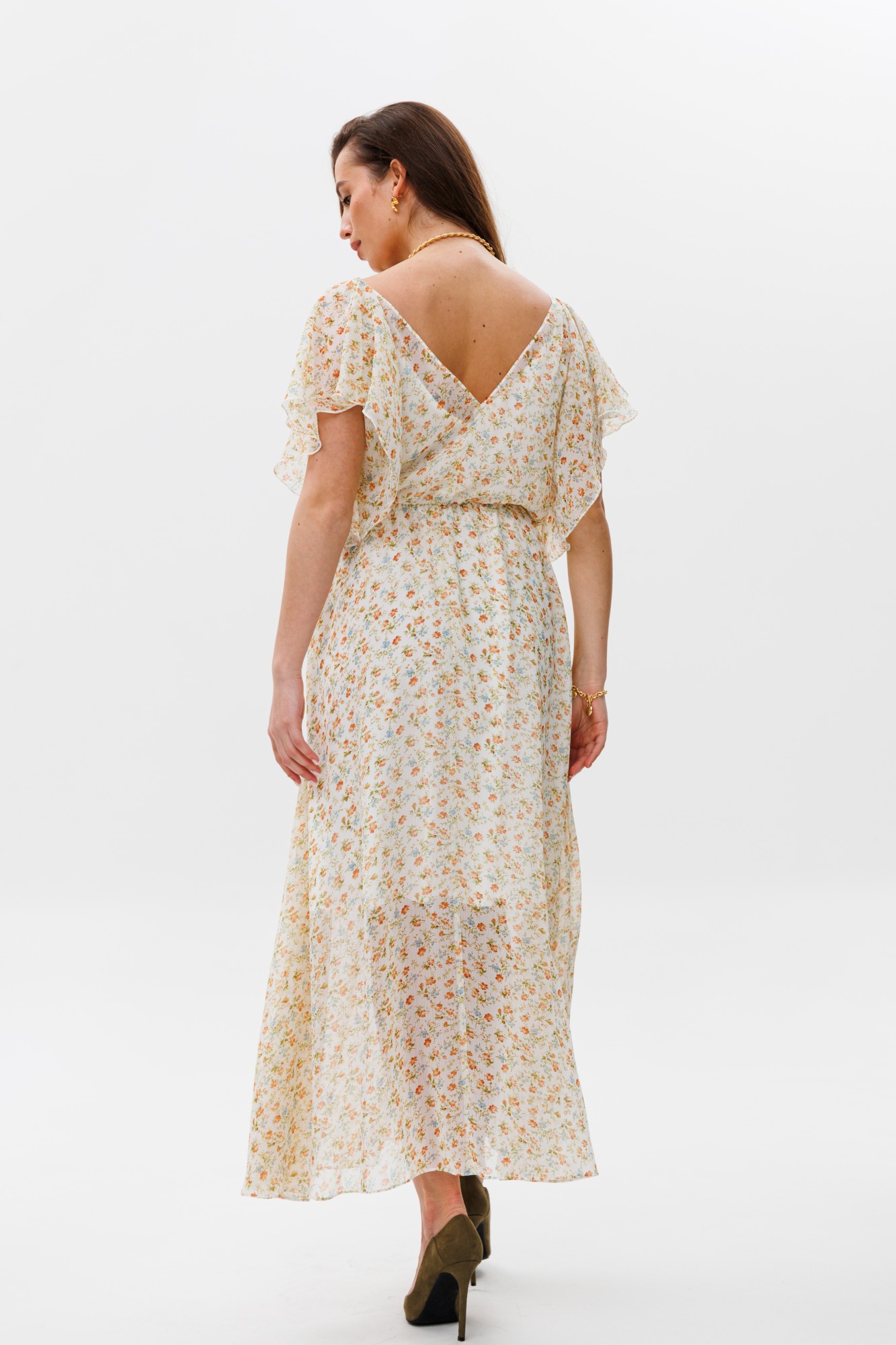 Женственное платье в пол отрезное по линии талии. Верхняя передняя часть платья состоит из двух частей. Правая передняя часть платья заходит левую переднюю часть по линии талии. Верхняя часть спинки платья со средним швом, с V-образным вырезом горловины. Рукав состоит из двух частей цельнокроеных с верхней передней частью платья и спинкой. На линии плеч детали рукавов соединяются короткими бретелями. Юбка платья покроя полусолнце по линии талии собрана на тесьму-резинку.