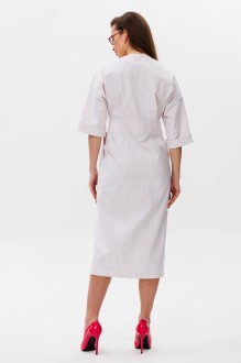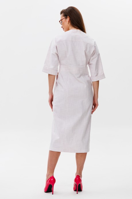 Эффектное двубортное платье длиной миди полуприлегающего силуэта. Линия плеча приспущена, рукав втачной три четверти. Горловина обработана обтачкой с V-образным вырезом. Линия талии акцентирована притачным поясом. Имеются карманы в боковых швах. Изделие застёгивается на пуговицы. Без подкладки.