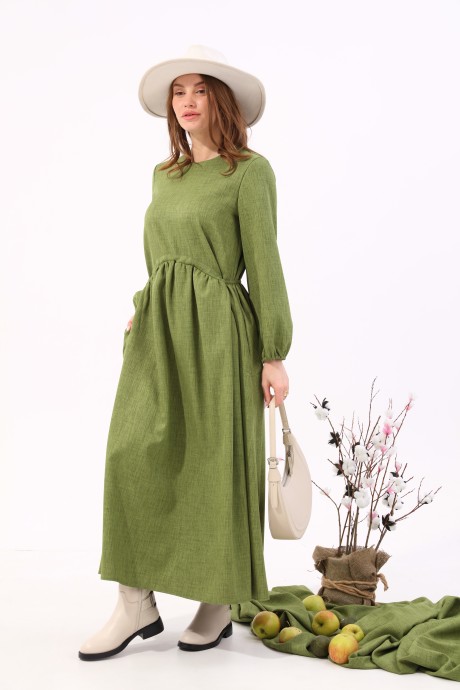 Оригинальное платье макси. Лиф прямого кроя, имеет округлый вырез горловины, по линии талии собирается на кулису. По спинке застёжка на потайную молнию. В боковых швах карманы. Рукава-фонарики собраны на резинку. Юбка трапециевидной формы сводного кроя.