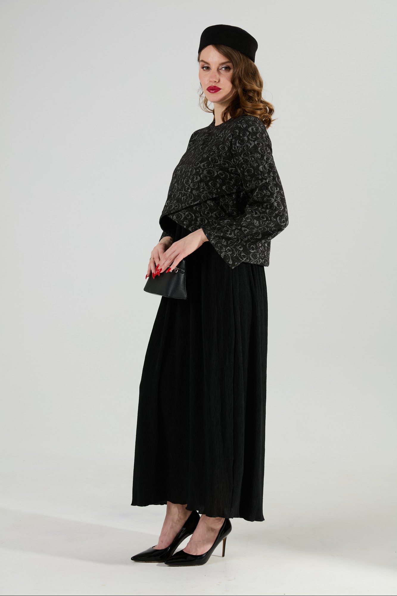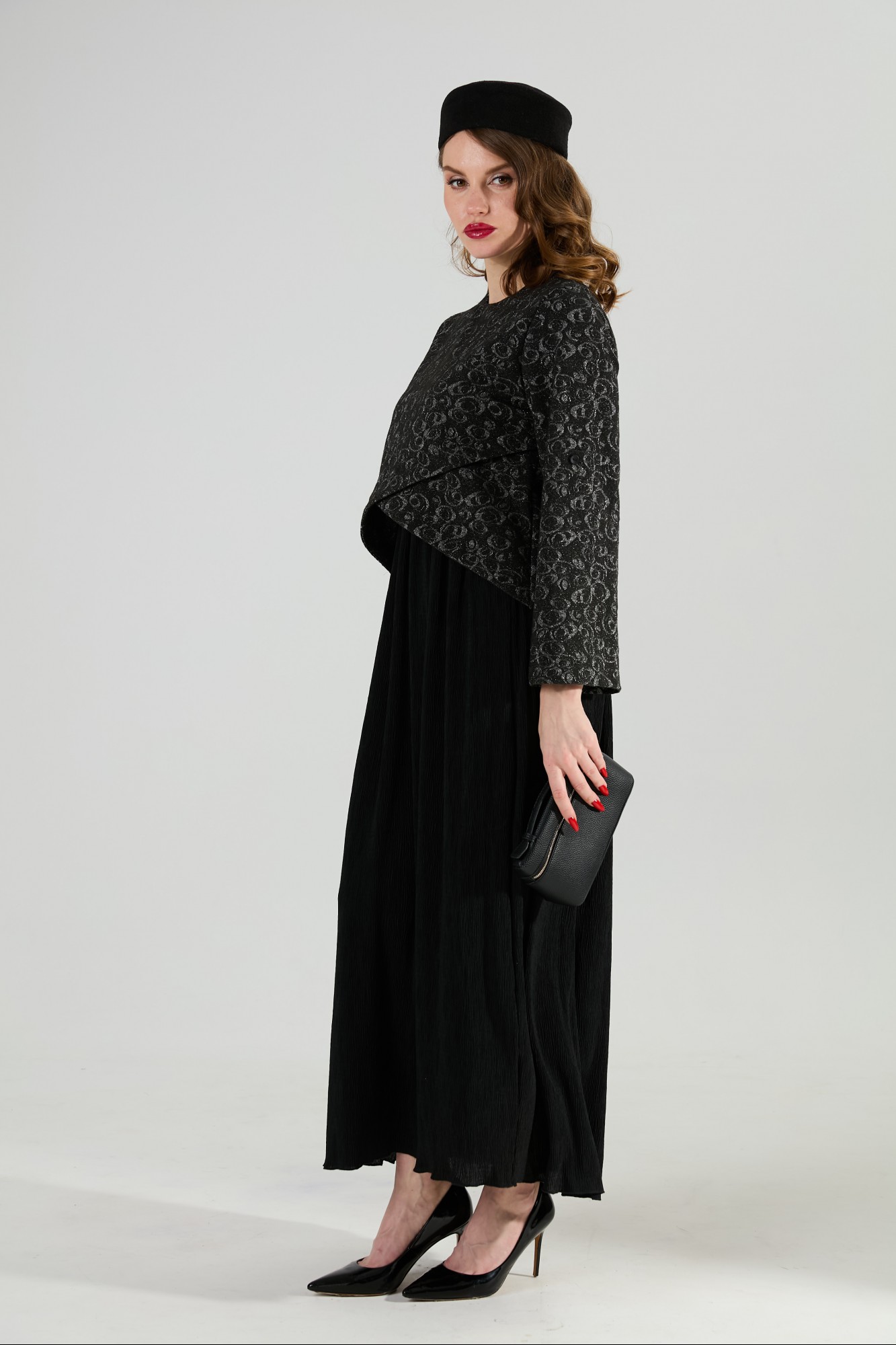Платье макси комбинированное, двухцветное. Лиф фигурный по низу. Вырез горловины полукруглый, по спинке затежка на молнию. Рукава втачные. Юбка на резинке, драпирующаяся, расширенного силуэта из шифона. На подкладке.