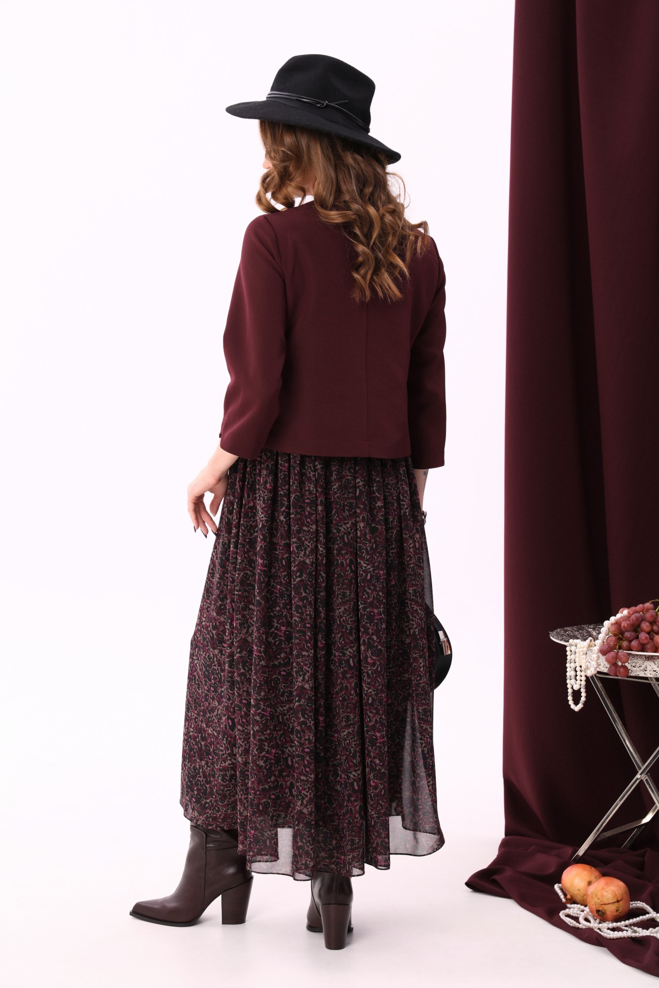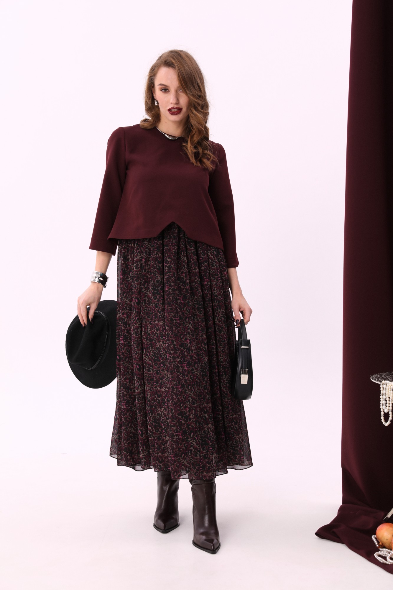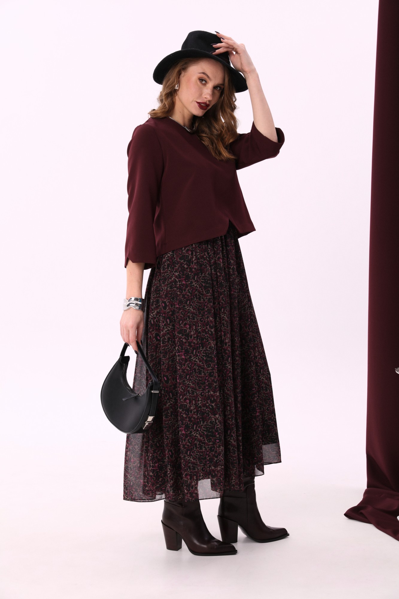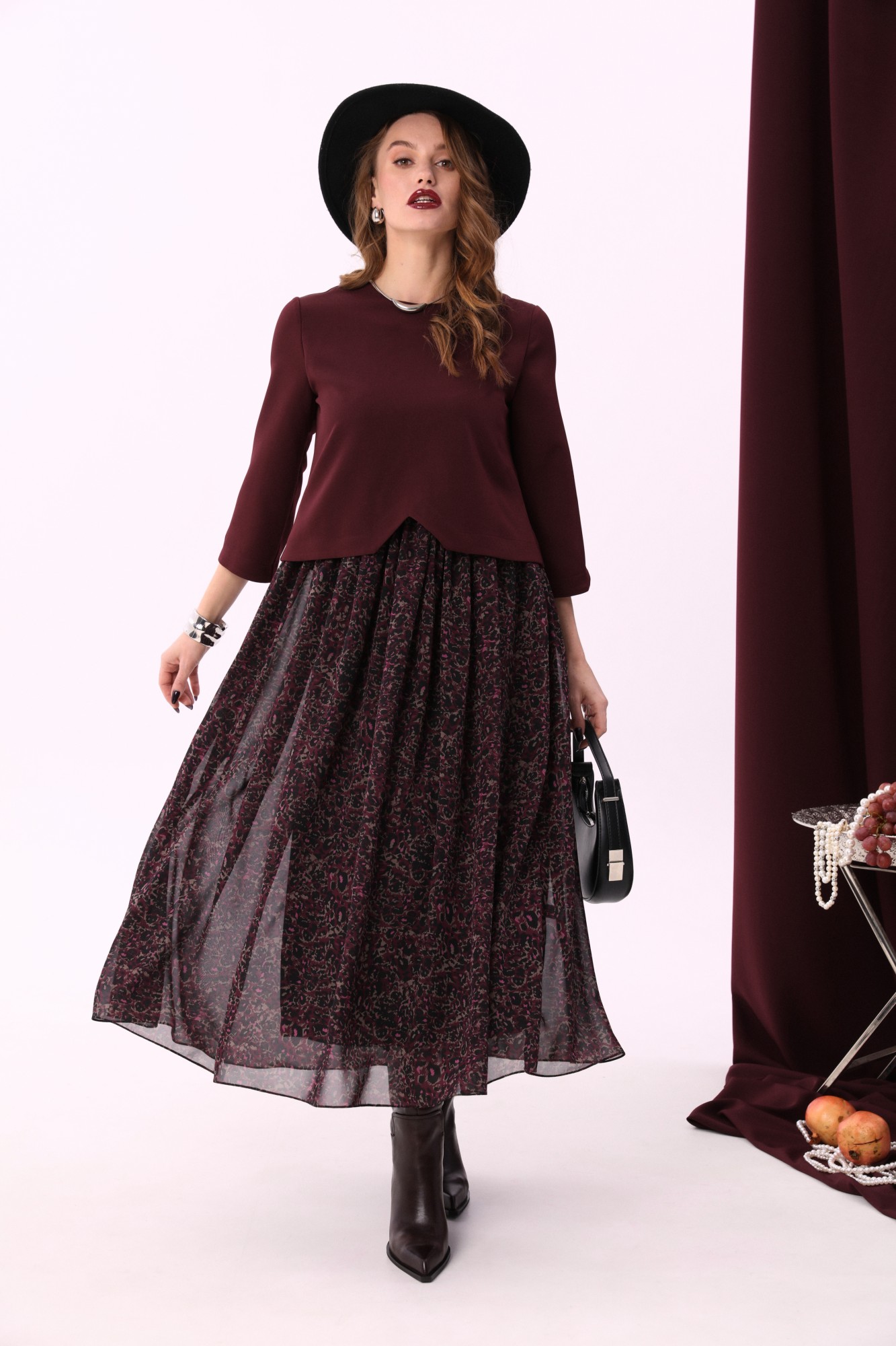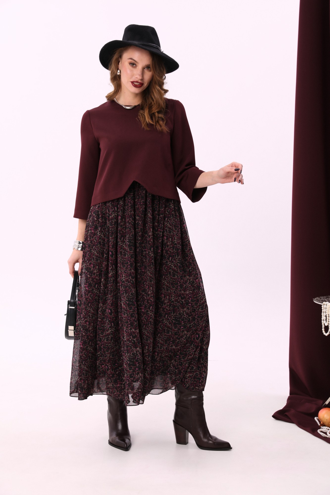 Платье макси комбинированное, двухцветное. Лиф фигурный по низу, выполнен из костюмной ткани. Вырез горловины полукруглый, по спинке затежка на молнию. Рукава втачные. Юбка на резинке, драпирующаяся, расширенного силуэта из шифона. На подкладке.