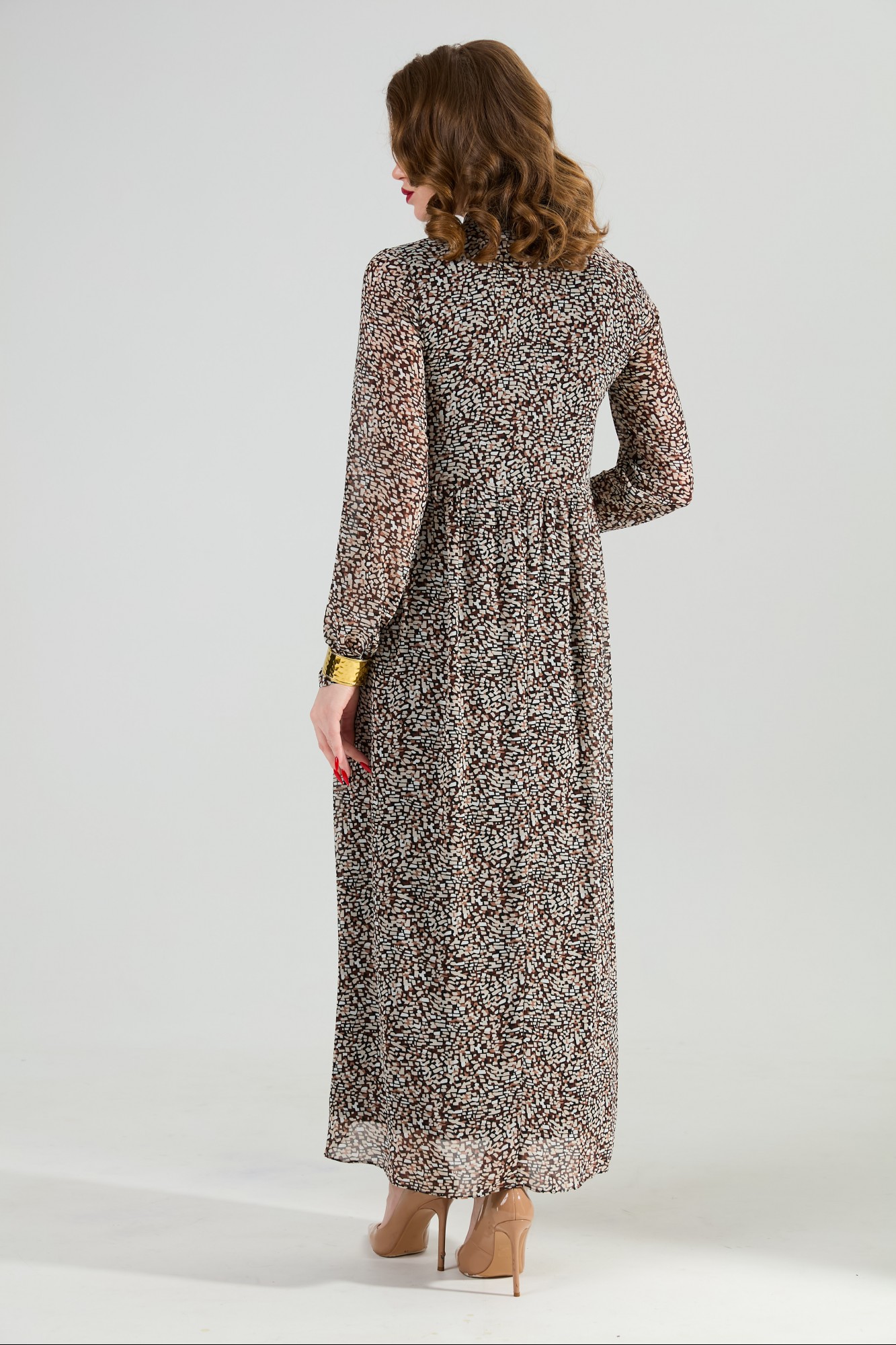 Платье макси прямого силуэта с V-образным вырезом, отрезное по линии талии. Горловине с имитацией чокера, застёжка на петлю и декоративную пуговицу. Рукав немного приспущен, по низу собран на манжет с петлей и пуговицей. Изделие на подкладке.
