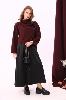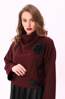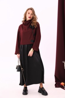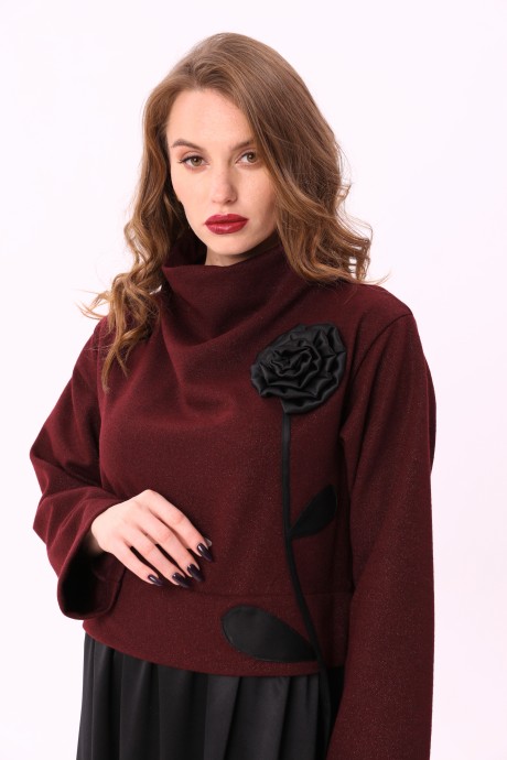 Платье прямого силуэта, состоящее из комбинации двух тканей - основной и отделочной. Воротник цельнокроеный хомут. Рукав одношовный, втачной, длинный. Нижняя юбка из отделочной ткани, со сборкой по линии талии. В виде отделки по левой части переда декоративный цветок из отделочной ткани.