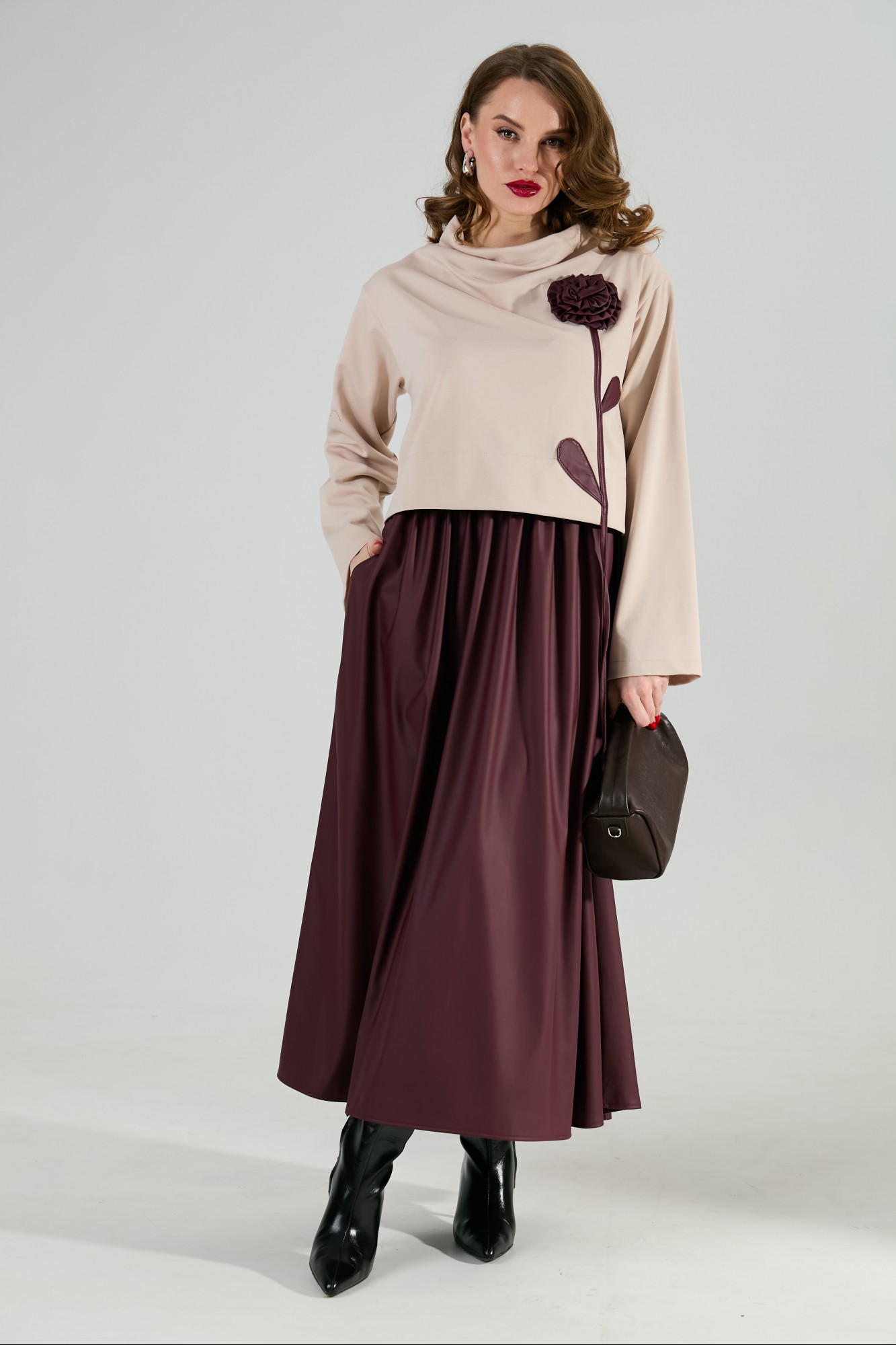 Платье прямого силуэта, состоящее из комбинации двух тканей - основной и отделочной. Воротник цельнокроеный хомут. Рукав одношовный, втачной, длинный. Нижняя юбка из отделочной ткани, со сборкой по линии талии. В виде отделки по левой части переда декоративный элемент из отделочной ткани.