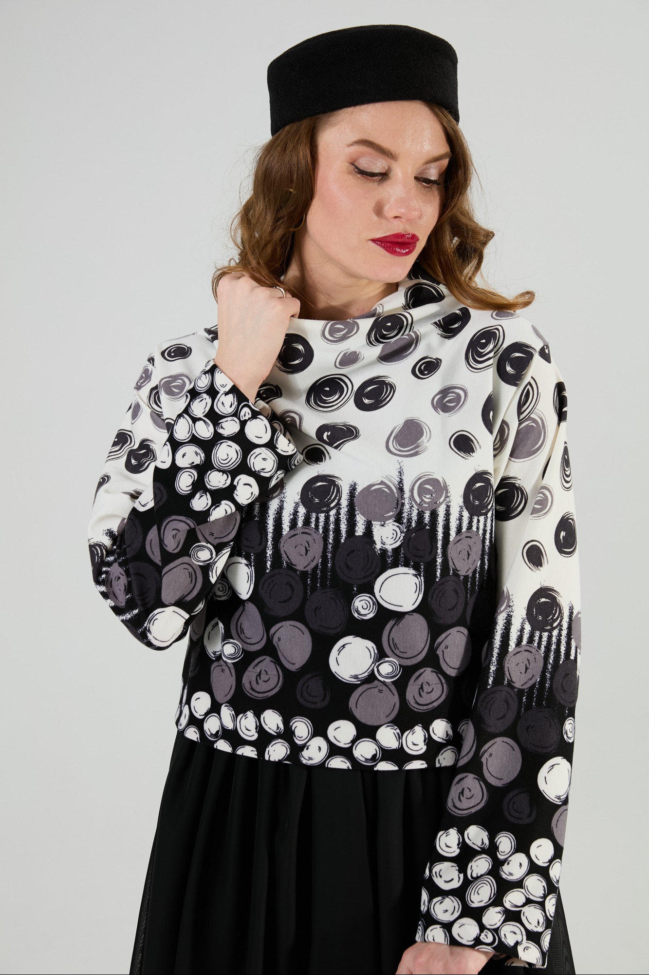 Платье прямого силуэта, состоящее из комбинации двух тканей - основной и отделочной. Воротник цельнокроеный хомут. Рукав одношовный, втачной, длинный. Нижняя юбка из отделочной ткани, со сборкой по линии талии. Юбка на подкладке.