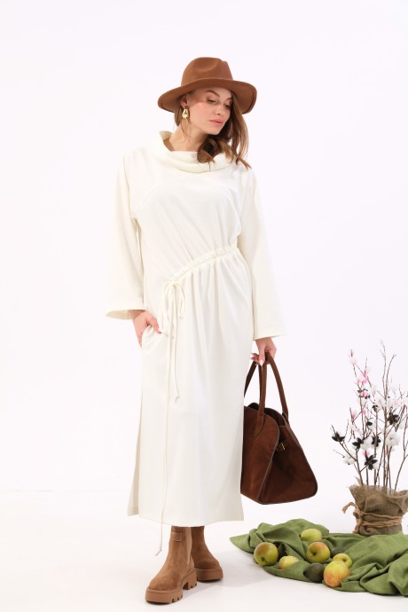 Элегантное платье свободного прямого силуэта длиной миди. Рукав реглан. Воротник-стойка. По переду фигурная надстрочная кулиса. В боковых швах расположены карманы.