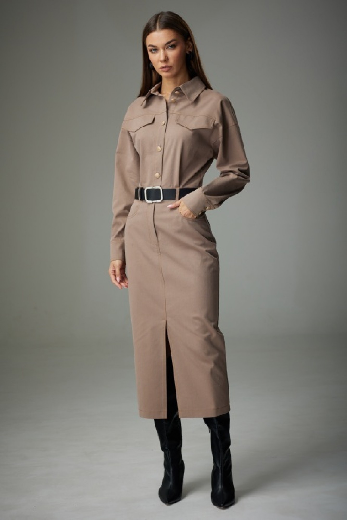 Платье выполнено из джинсовой ткани, полуприлегающего силуэта, покроя спущенное плечо, длинной за колено, зауженное к низу. Рукав длинный двушовный с манжетой по низу. Данное платье создает эффект блузы заправленной в юбку по талии. По переду и на спинке расположена горизонтальная кокетка, по спинке средний шов. По переду в шов притачивания кокетки вставлены клапаны. Горловина оформлена стояче-отложным воротником с отрезной стойкой. В верхней части переда расположена застежка-планка на пуговицы. В области талии по спинке и по переду расположен пояс-кокетка со шлевками. Нижняя часть платья оформлена как юбка – с разрезом по переду, с закругленными джинсовыми карманами в области бедер и застежкой на гульфик.