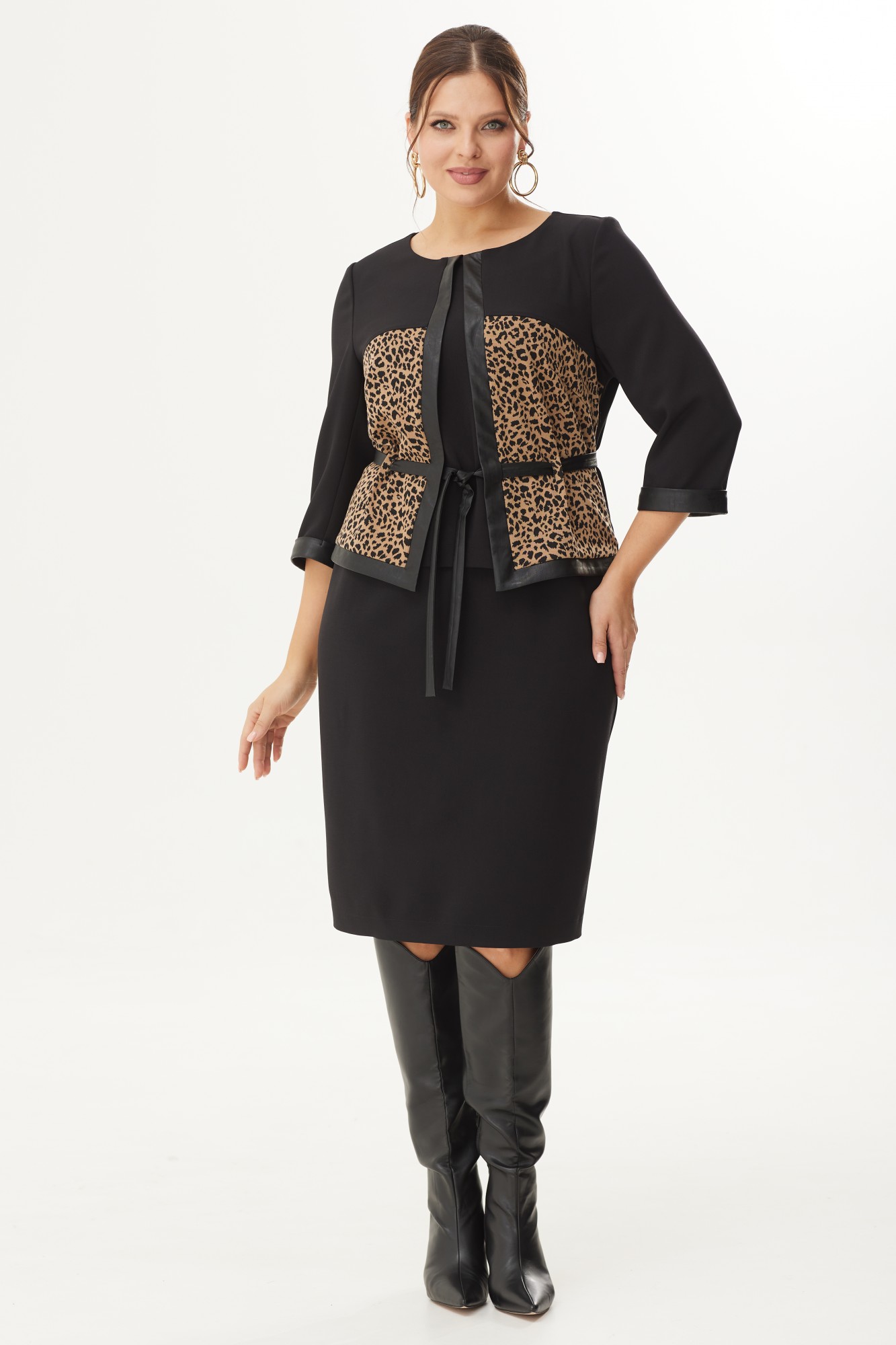 Платье полуприлегающего силуэта, втачного покроя. Верхняя часть переда и спинка на подкладке. Рукав ¾ с отрезной манжетой из отделочной ткани (экокожа). Платье резное. По спинке расположены талевые вытачки и средний шов, переходящий в шлицу. Верхняя часть спинки отлетная (имитирующая жакет), с застроченной складкой по центру, фиксирующаяся обтянутыми(экокожа) пуговицами, которые также служат отделкой. Верхняя часть переда состоит из кокеток и центральной верхней части из основной ткани, боковых частей из отделочной ткани, центральной и нижней планки из экокожи (отделочной ткани). В шве притачивания планки в области талии расположены прорези для пояса, также в боковых частях переда обметаны петли в заложенные складки (для продевания пояса из отделочной ткани (экокожи)). Рукав двухшовный, втачной. Горловина округлой формы.