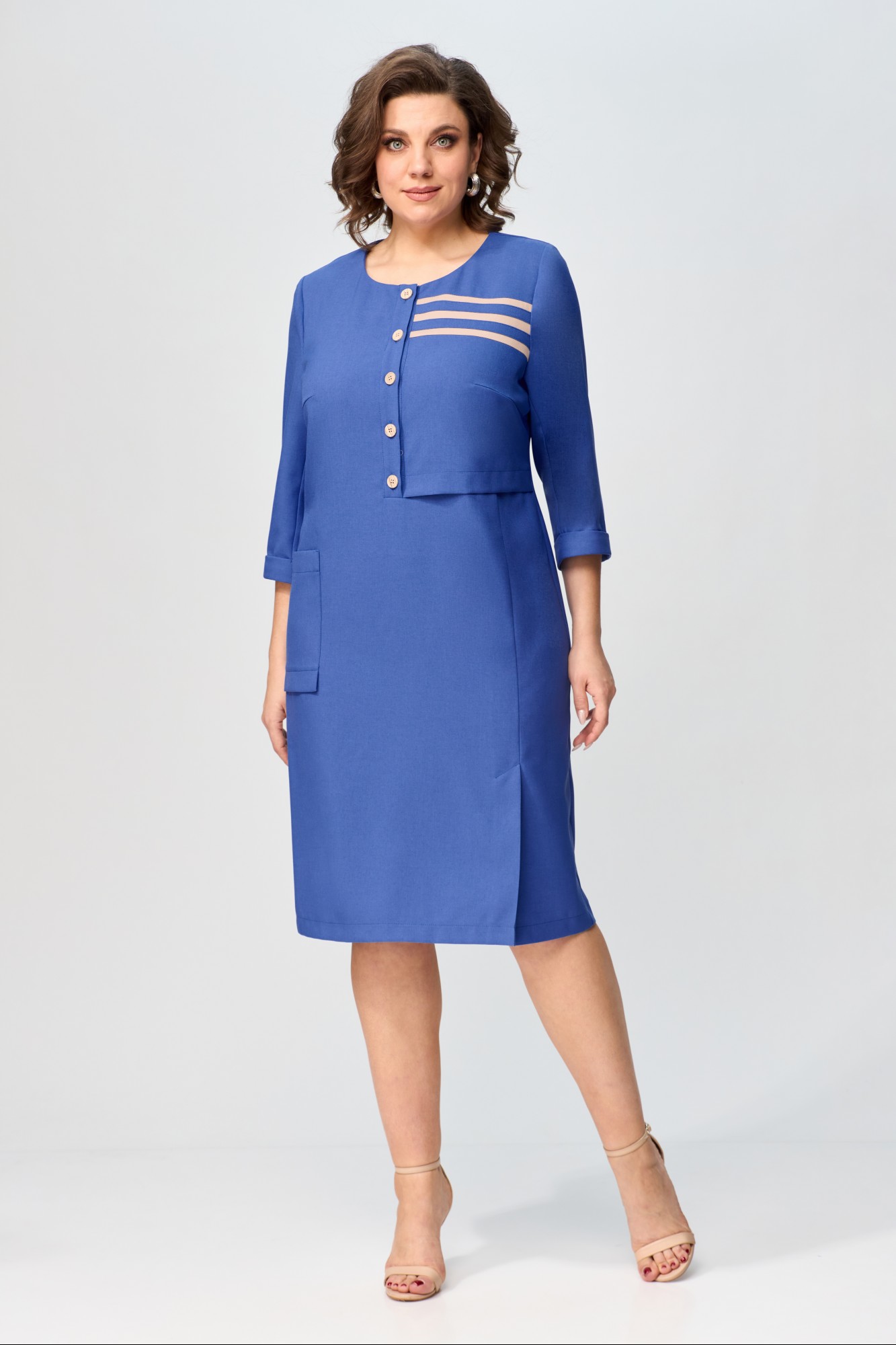 Платье женское, полуприлегающего силуэта, втачного покроя с центрально-бортовой застежкой на притачную планку на петли-пуговицы до линии талии. Рукав с манжетой, горловина округлой формы. По переду платье ассиметричное: в левой части переда расположена отлетная кокетка до уровня талии с деталями в области плеча из отделочной ткани, в правой части в области бедер расположен накладной карман. Дополнением платья служат пуговицы в цвет отделки.