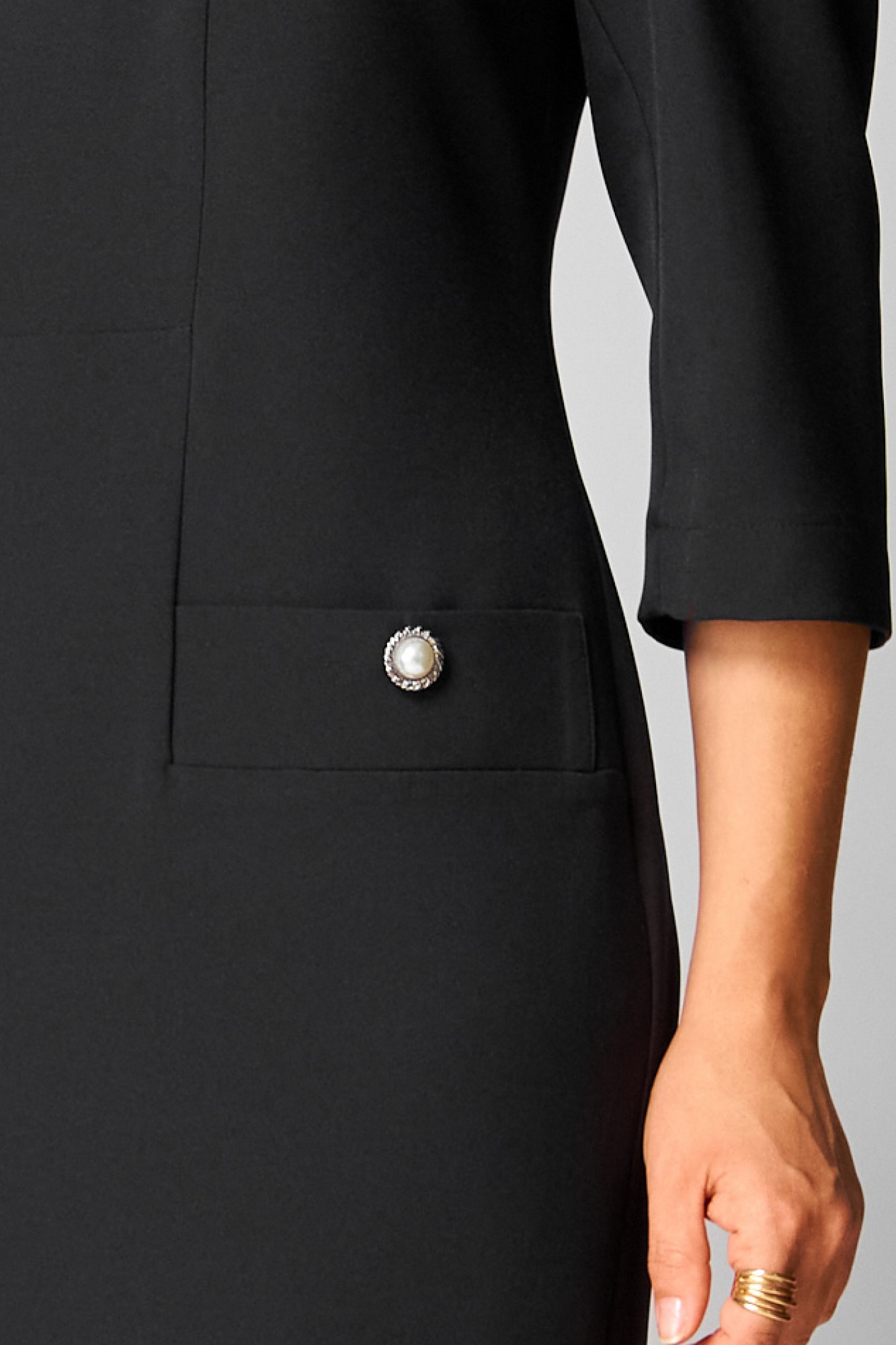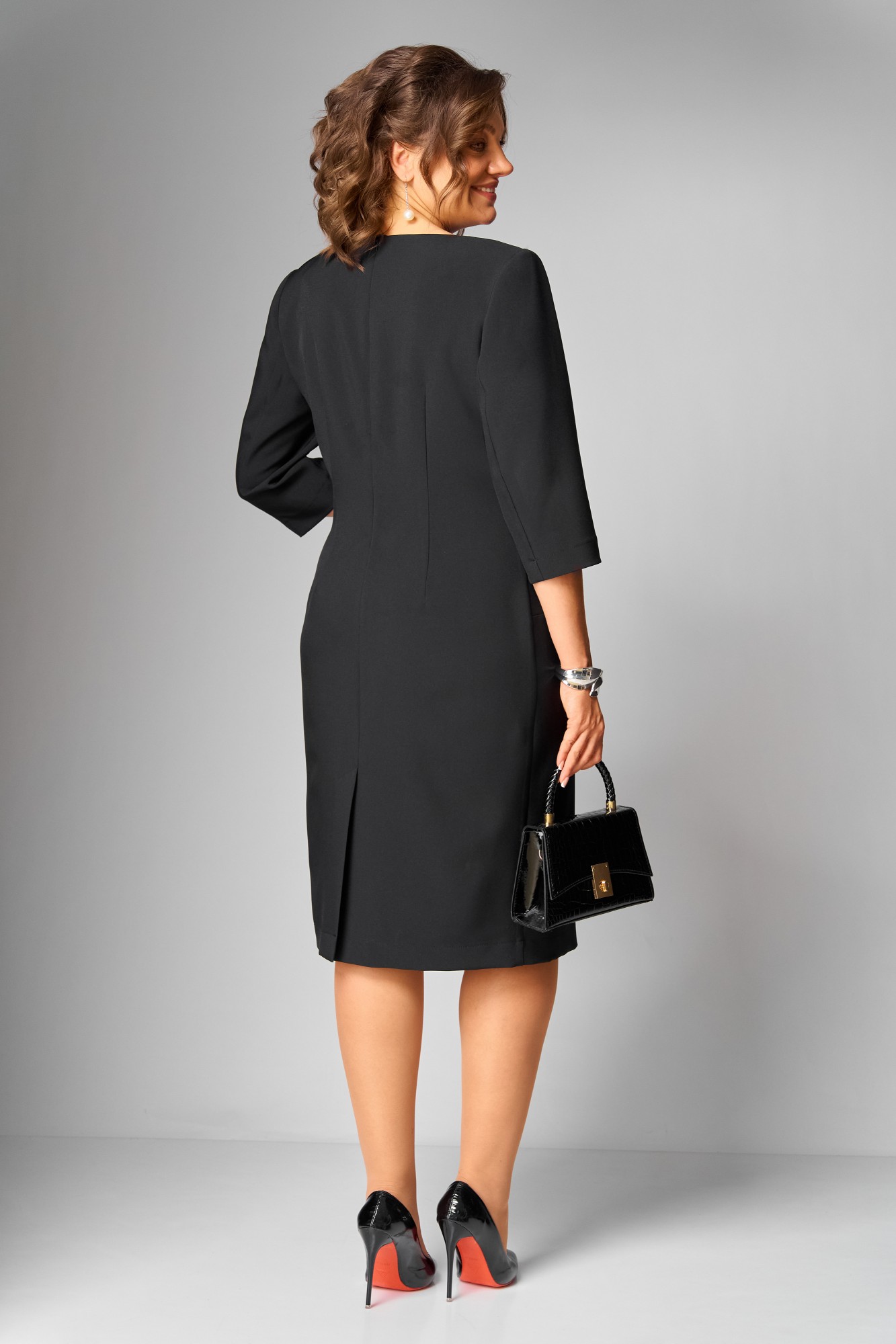 Платье женское полуприлегающего силуэта, втачного покроя с имитацией застежки по переду до подрезной линии, в бочках расположены листочки. Горловина округлой формы, рукава ¾ длины, двухшовные. Спинка со средним швом, в котором расположена тесьма «молния» и шлица, а так же вертикально направленные таллиевые вытачки. Платье выполнено из однотонной ткани костюмно-плательной группы.