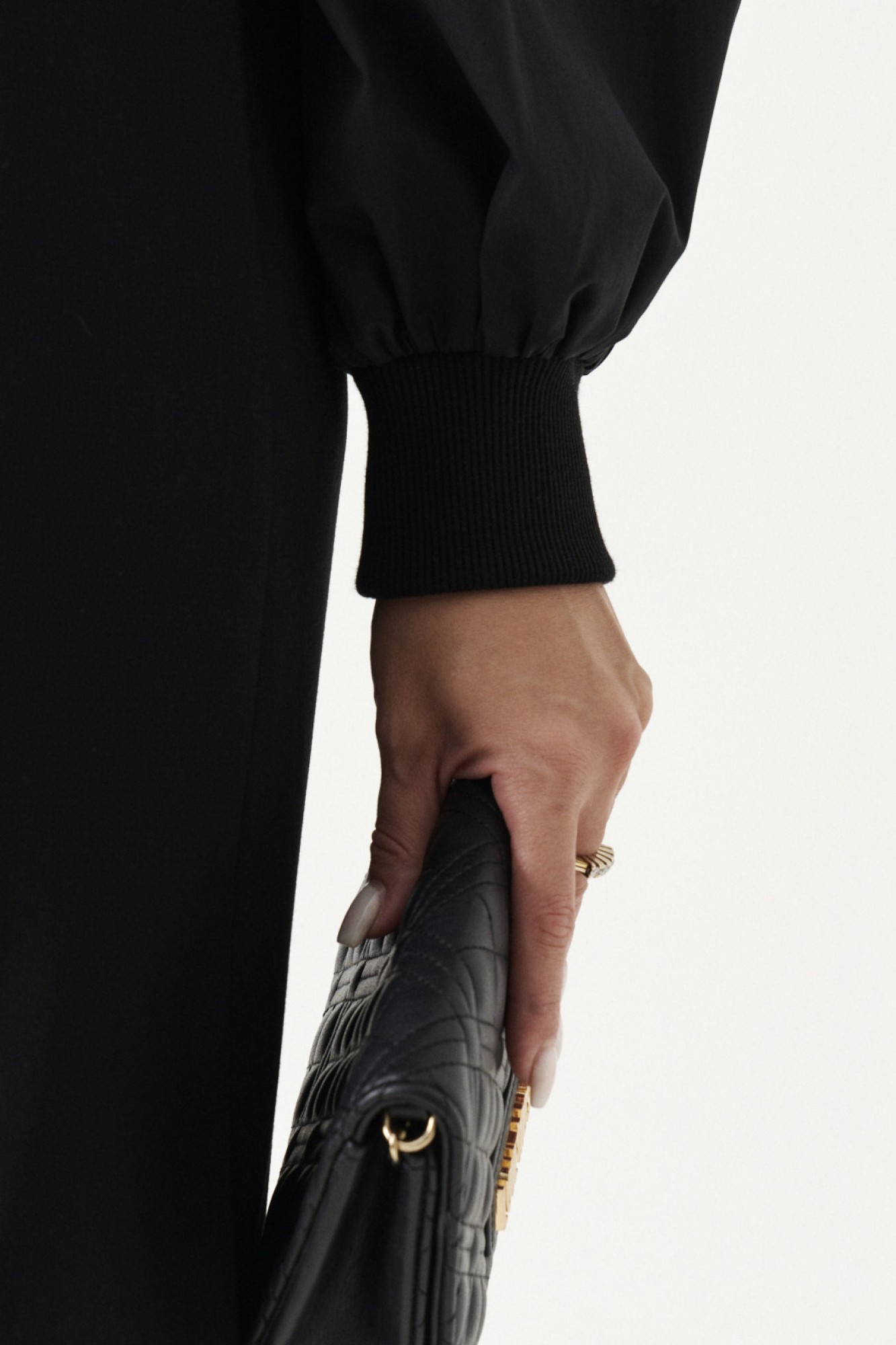Платье женское из смесовой ткани для повседневной носки прямого силуэта. Перед имеет нагрудные вытачки. Спинка с средним швом, застежка молния располагается в среднем шве спинки. Горловина расширенная. Рукав реглан , низ рукава обработан манжетой на резинке. В боковом шве имеются небольшие разрезы, а также имеются боковые прорезные карманы в шве. В качестве подчеркивания фигуры идет пояс. Платье многофункциональное, которое можно носить разными способами. В нем вы будете чувствовать себя комфортно и легко.